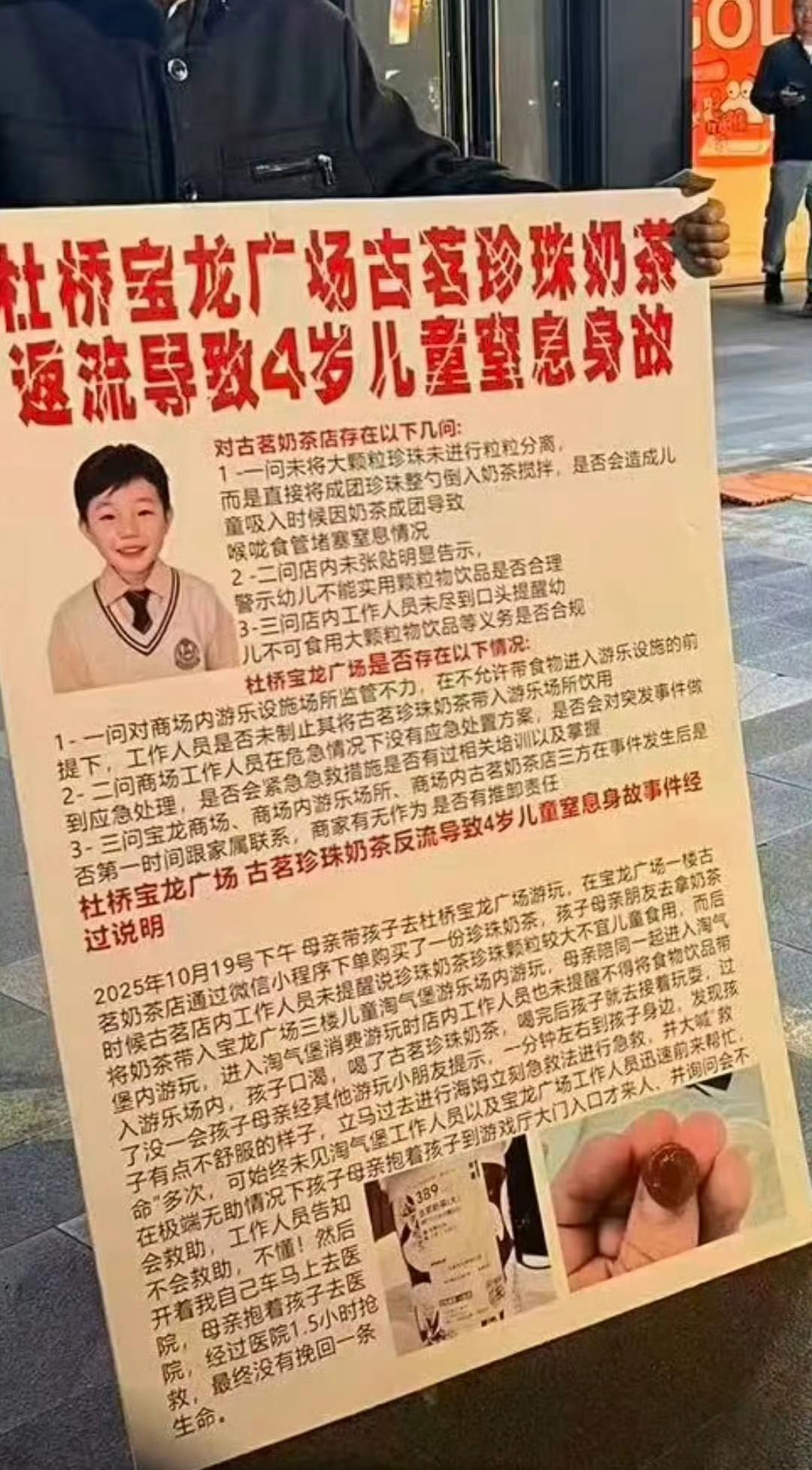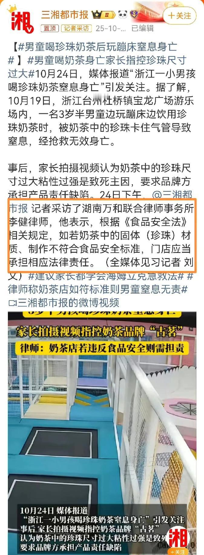 3岁娃蹦床时被珍珠奶茶噎死,家长、游乐场、奶茶店互扯责任,真相到底在哪? 3岁娃喝珍珠奶茶玩蹦床窒息身亡,这事看得让人揪心! 浙江台州有个3岁娃,喝了珍珠奶茶后去游乐场玩蹦床,结果被珍珠噎住卡在喉咙里无法呼吸,没有抢救过来。 孩子爸爸李先生说,19号孩子喝完奶茶去游乐场玩,才过去了一分多钟就陷入昏迷了。送医院抢救一个多小时,还是没有留住小孩的生命。他觉得孩子的死,和奶茶太稠、游乐场救助不到位都有关系。现在三方在调解,要是谈不拢,就准备走法律程序。 游乐场的负责人却说,他们已经尽到救助责任了。当时家长吓得神志不清,还是店长抱着孩子开着家长的车送医院进抢救室 的。 奶茶店那边,工作人员说公司总部已经有人来处理这件事了。 杜桥镇政府也说了,有人在跟进处理。 这事儿真让人痛心。咱当家长的,以后给孩子喝带珍珠、椰果这些的饮品,可得多上心。游乐场也得加强安全管理和急救措施,别让悲剧再次发生。你能接受玉米当燃料这种做法吗 狗是人类的朋友,这句话是谁说的 在你老家,外婆怎样称呼 请用一句话评价赵本山 今年猪肉为啥这么便宜 老人拦婚车要红包,到底该不该给? 发霉的花生和坚果可以吃吗 坐未成年电动车被撞伤自担5成责 开车逆行,有人故意撞你,谁的责任 高速开车,哪些行为让你特别反感 中国的科技超美国了吗 秦始皇帝陵用松或柏木能反映等级差异吗 健康和财富你认为哪个更重要
