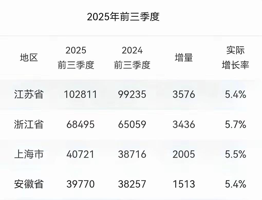 广东、江苏、浙江三省的 2025 年前三季度 GDP 对比,江苏继续狂追广东,目前差距只剩 2300 多亿元,但是全年超越广东仍然不太可能! 广东前三季度增速还是不高,受到多方面影响,已经非常难得了,增速只有 4.1%,但增量还是不错的,近 3000 亿元。 只是江苏更猛,增量超过 3500 亿元,增速达到 5.4%,跑赢全国平均增速。 从数据来看,长三角地区省份增速都是非常不错,广东要顶住压力啊! 对此大家怎么看?欢迎评论区留言讨论!