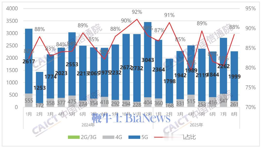 2025年1-8月,国内市场手机出货量1.92亿部,同比下降1.7%,其中,5G手机1.63亿部,同比下降1.0%,占同期手机出货量的85.1%。