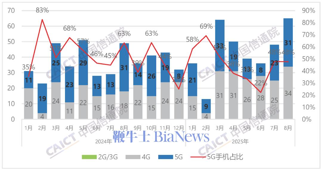 2025年8月,国内手机上市新机型65款,同比增长32.7%,其中5G手机31款,与上年同期持平,占同期手机上市新机型数量的47.7%。