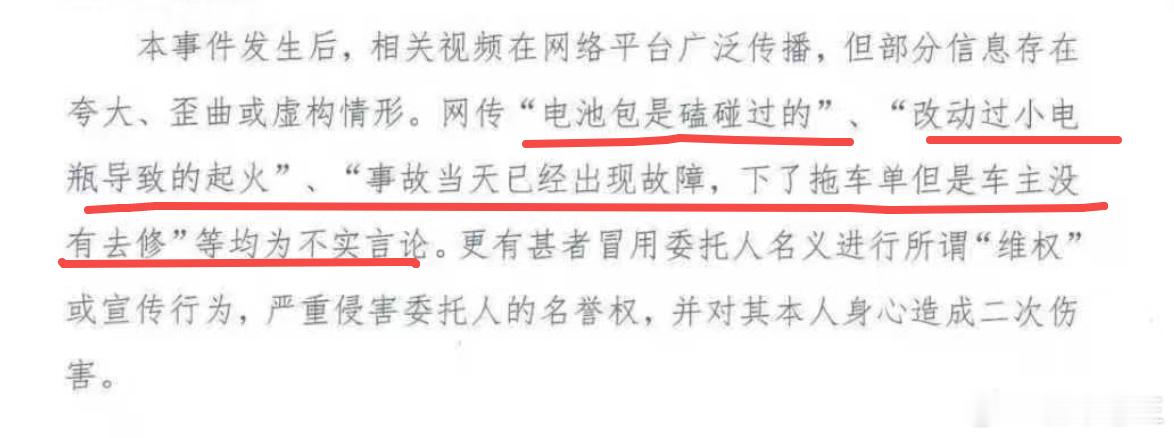 车主的律师声明,还是写的很严谨的。 那么从车主的律师声明描述来看, 之前并没有磕碰过,既然有律师声明,那么就意味着车主愿意为律师声明中的描述,如——磕碰为不实信息,改动过小电瓶导致起火为不实信息。 这些描述车主愿意负法律责任,那么既然敢于这么描述,就变相说明了车主在车辆使用方面是没问题的。至少我目前是这么看的。