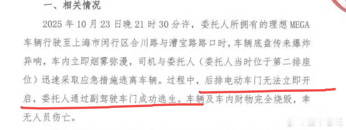 律师函描述的也很清晰,司机与委托人当时位于第二排座位)迅速采取应急措施逃离车辆。过程中,后排电动车门无法立即开启,委托人通过副驾驶车门成功逃生。这一点也与理想汽车当时的回复不一致,理想汽车声称车门顺利打开,请问顺利打开在哪里了? 顺利打开能让委托人通过副驾驶车门成功逃生? 这是目前争议比较大的地方。