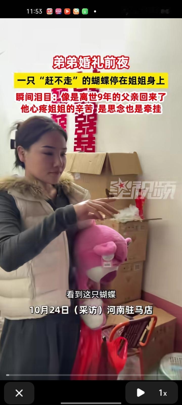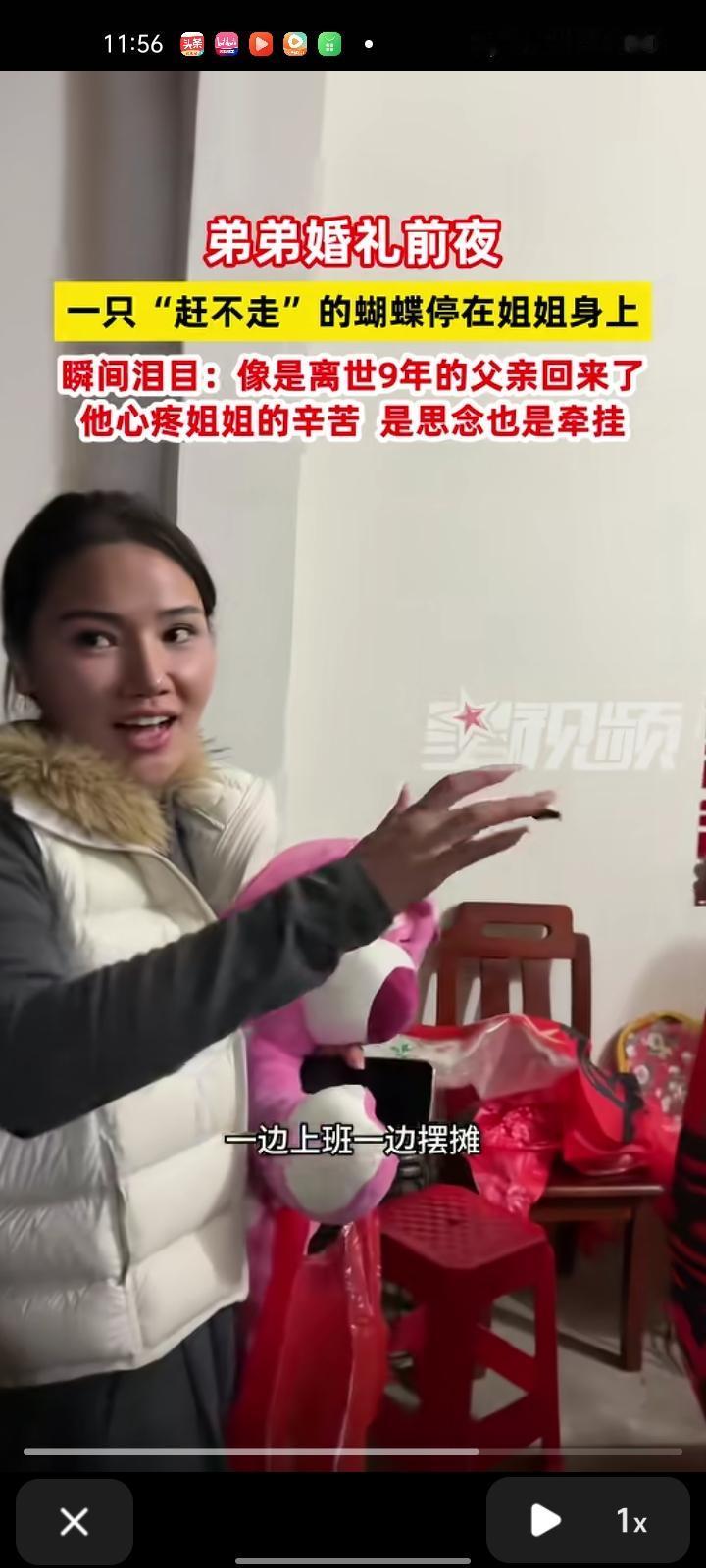10月22日,驻马店市泌阳县。弟弟婚礼前夜,一只“赶不走”的蝴蝶,爬到姐姐身上,姐姐看了瞬间泪目。姐姐李女士称,父亲大概九年前去世的,当时弟弟在上大一,现在弟弟研究生毕业了,担任大学老师。如果说亲人寄托思念之情,肯定会感到非常欣慰。父亲去世后,她就开始一边上班一边摆摊。