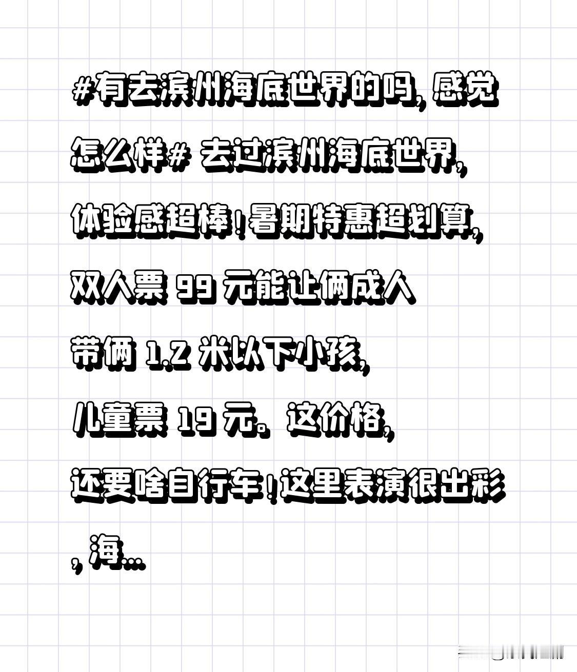 我去过滨州海底世界,体验感绝佳!暑期特惠相当划算,双人票 99 元能让两名成人携带两名 1.2 米以下的小孩,儿童票只需 19 元。这价格,还要啥自行车! 这里的表演十分精彩,海洋奇缘·空中魔方秀中,杂技演员在高空翻转,灯光与旋律的配合极具震撼力;夜上海·海底旗袍秀,将旗袍与海洋完美融合,美得让人说不出话。 520 告白季的福利也不少,有甜蜜双人票、超值家庭票、大学生专享双人票,能满足不同人群的需求。带对象来,在海底隧道里十分浪漫;带孩子来,能尽享亲子欢乐。总之,这是个消暑又好玩的好地方!