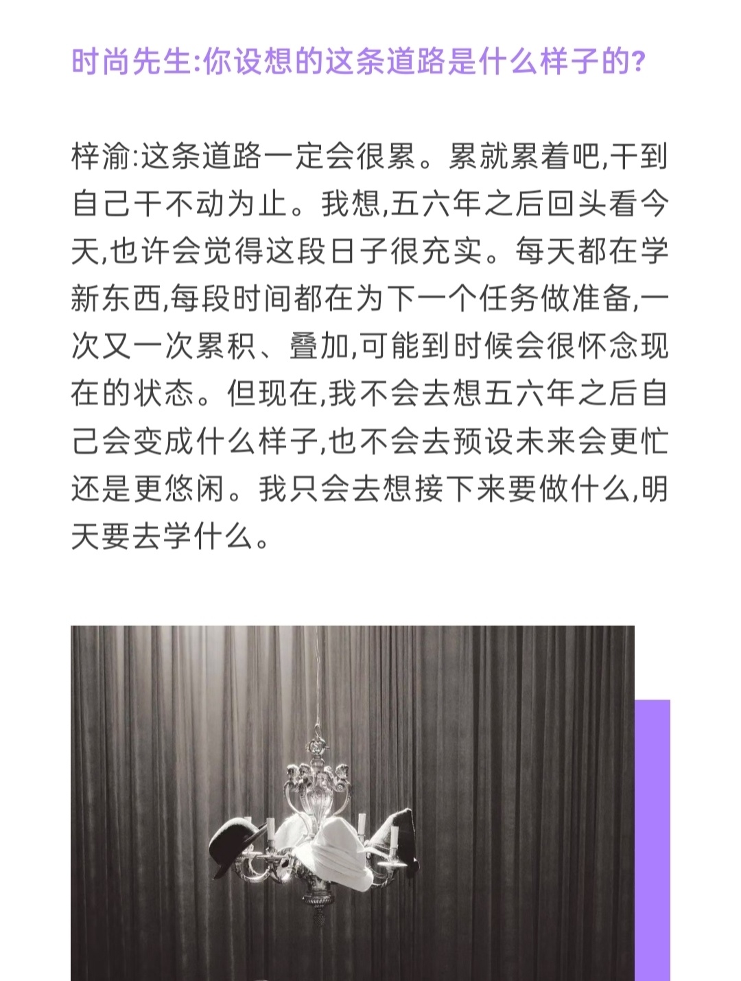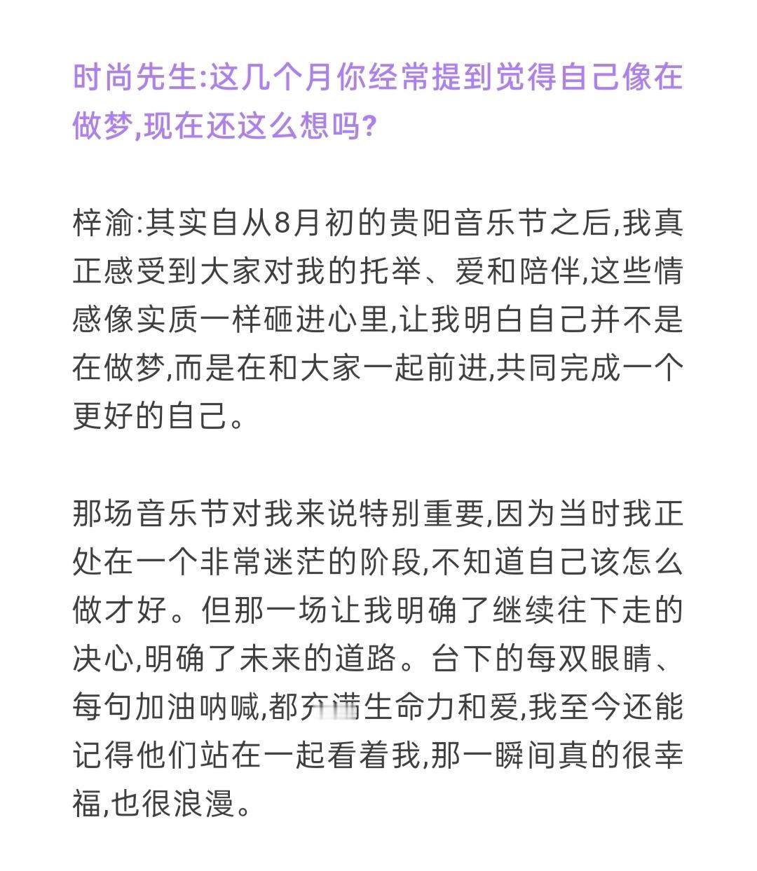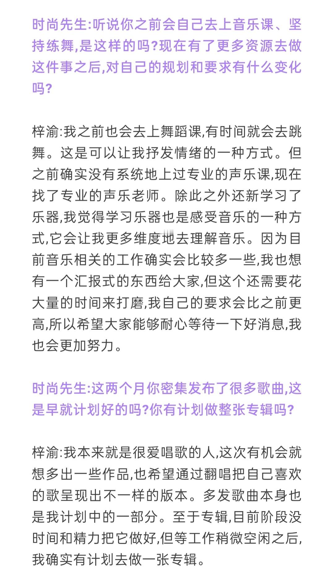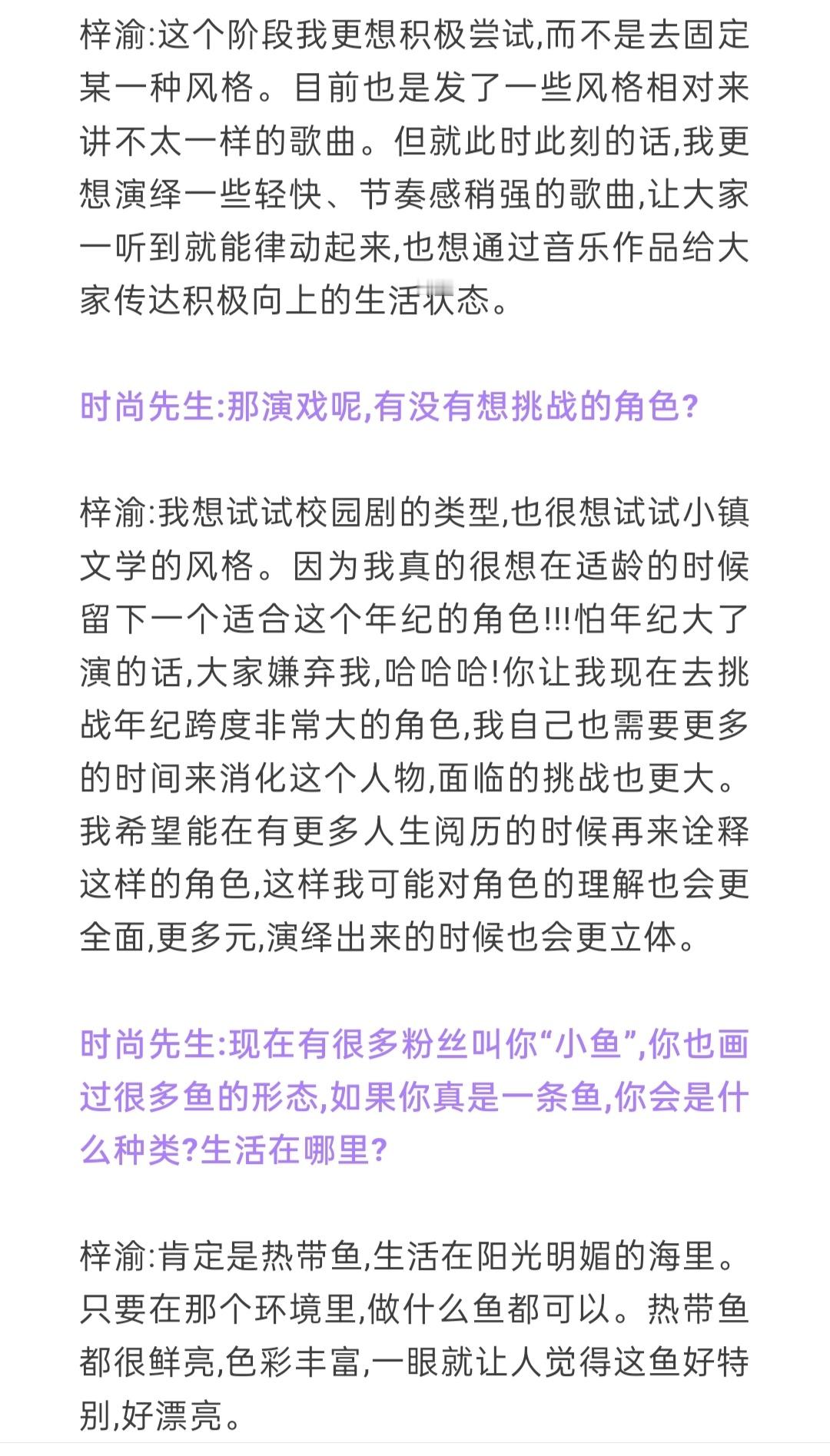 专辑,目前阶段没时间和精力把它做好,但等工作稍微空闲之后,我确实有计划去做一张专辑。梓渝喜欢在舞台上被注视梓渝时尚先生采访