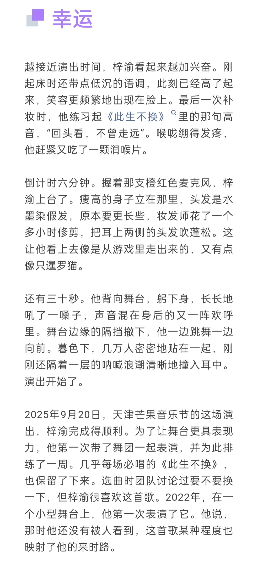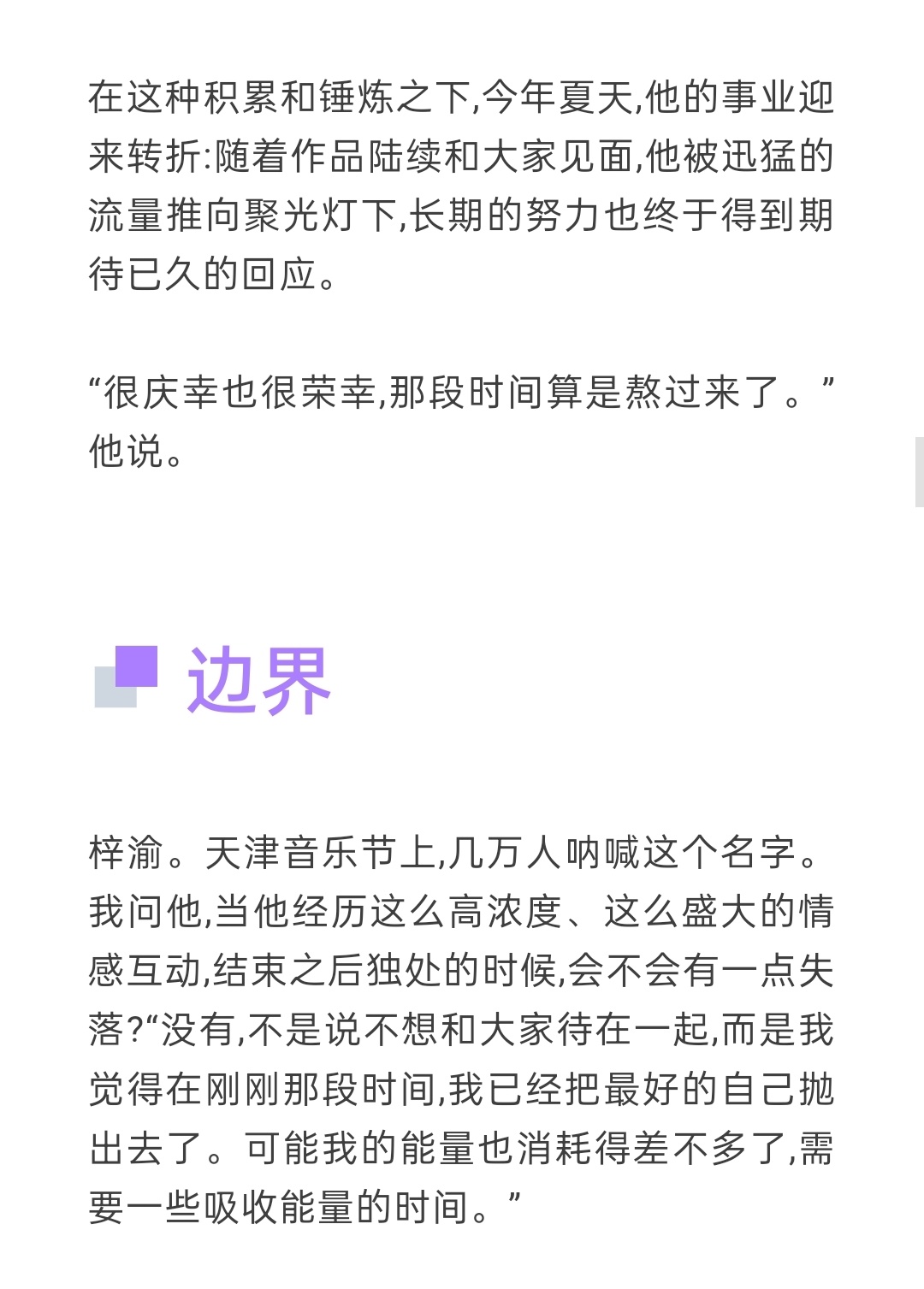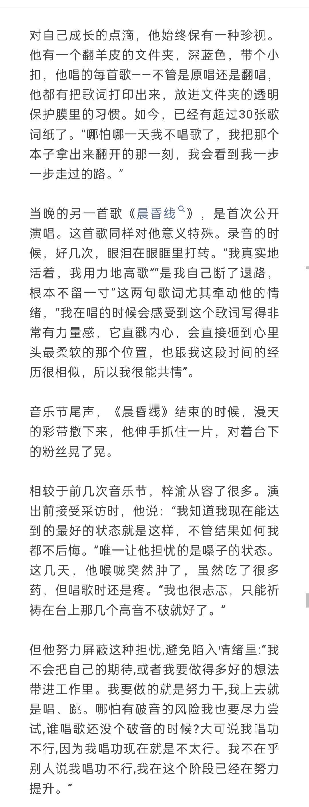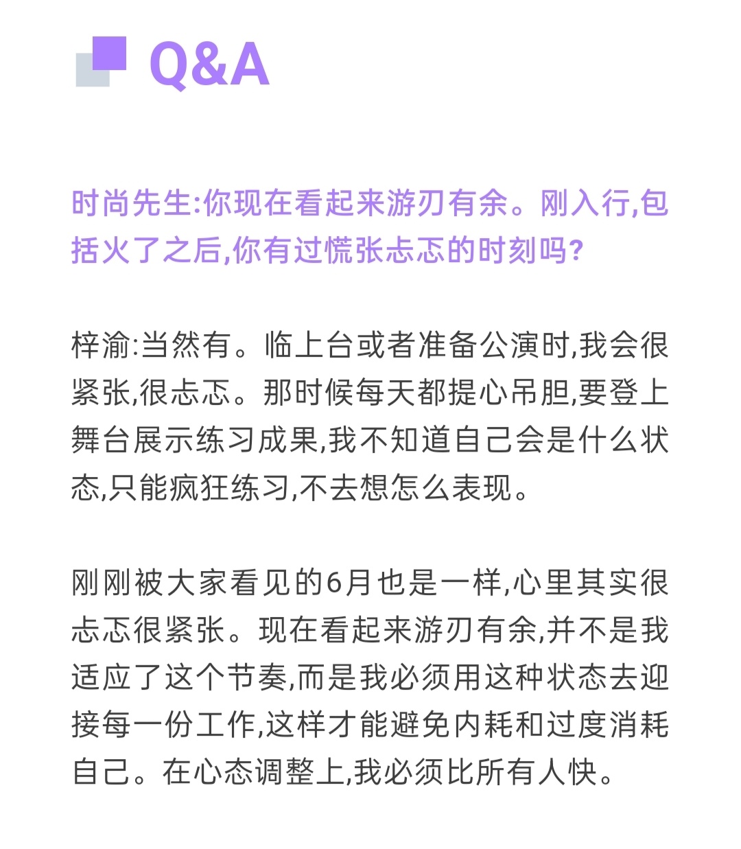 专辑,目前阶段没时间和精力把它做好,但等工作稍微空闲之后,我确实有计划去做一张专辑。梓渝喜欢在舞台上被注视梓渝时尚先生采访
