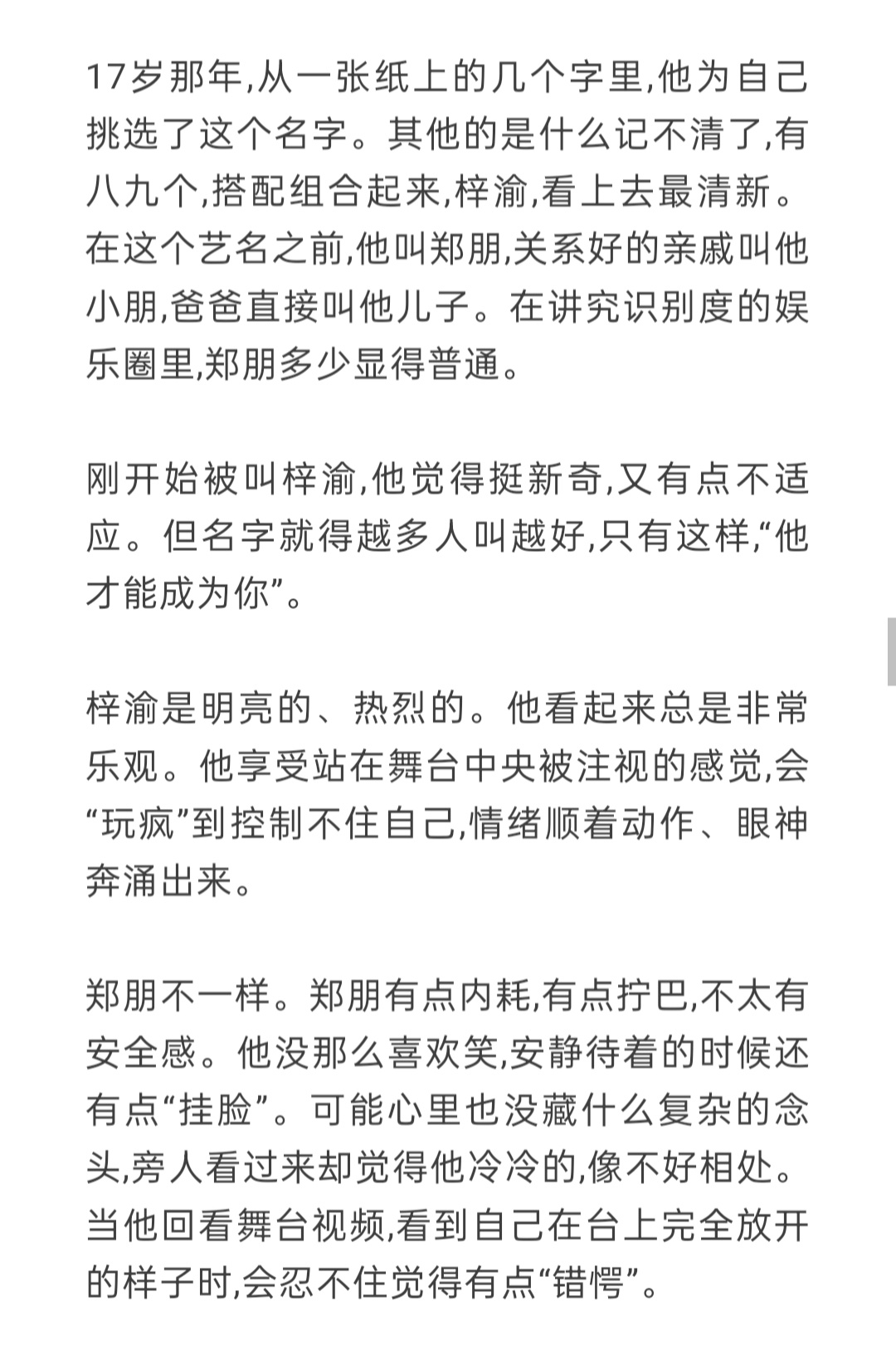 梓渝是明亮的、热烈的。他看起来总是非常乐观。他享受站在舞台中央被注视的感觉,郑朋不一样。郑朋有点内耗,有点拧巴,不太有安全感。他没那么喜欢笑,安静待着的时候还有点“挂脸”。不管哪一面都是他,不扮演,不伪装。