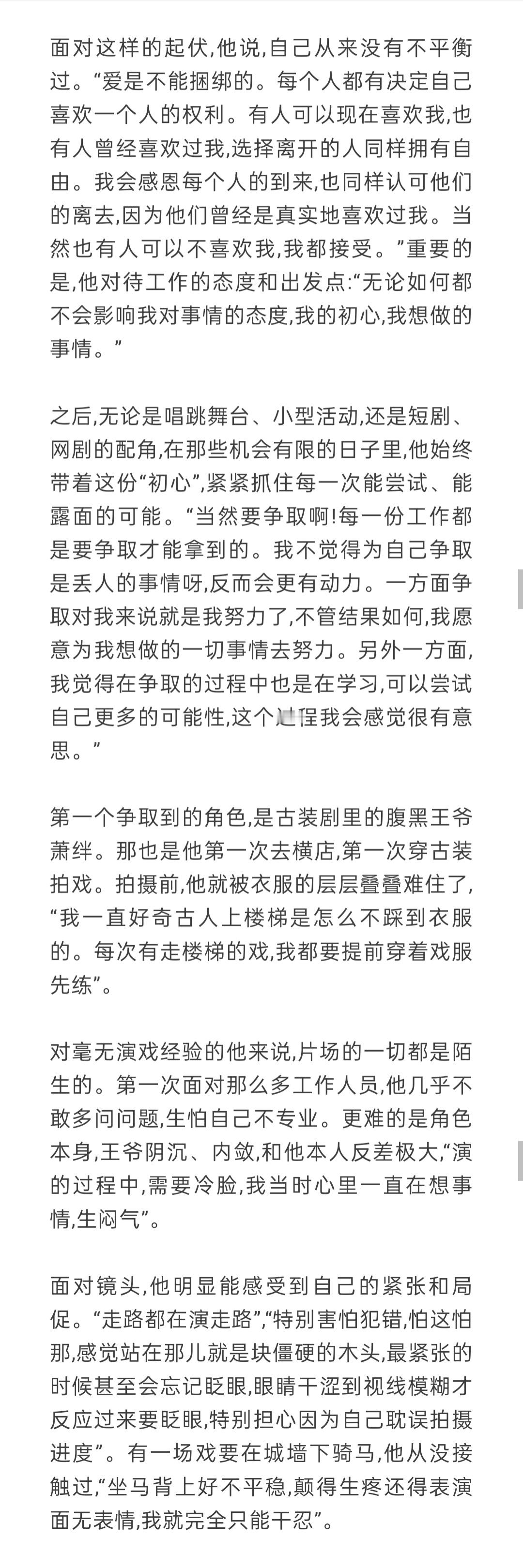 “爱是不能捆绑的。每个人都有决定自己喜欢一个人的权利。我会感恩每个人的到来,也同样认可他们的离去,因为他们曾经是真实地喜欢过我。当然也有人可以不喜欢我,我都接受。”