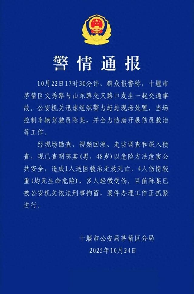 10月25日凌晨,平安茅箭发布警情通报:10月22日17时30分许,群众报警称,湖北十堰市茅箭区文秀路与山东路交叉路口发生一起交通事故。公安机关迅速组织警力赶赴现场处置,当场控制车辆驾驶员陈某,并全力协助开展伤员救治等工作。