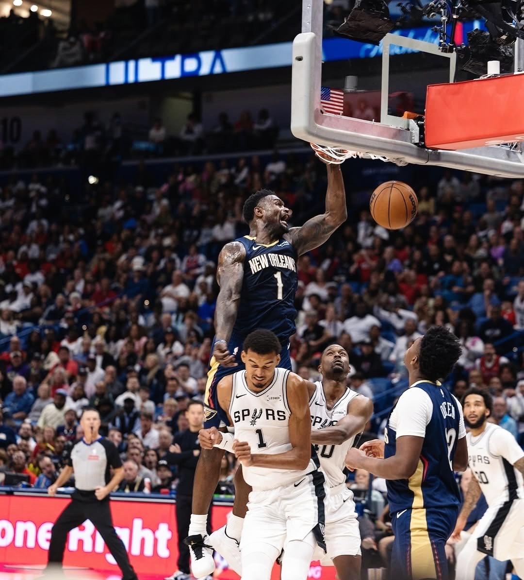 锡安单臂隔扣文班亚马,但随后挨了文班3记封盖! 马刺客场加时力克鹈鹕,开局第一球锡安就冲进内线暴起隔扣了文班亚马!同样的1号,状元对状元,面对文班亚马胖虎不甘示弱,但随后文班在防守端给了锡安3记封盖找回了面子。 文班亚马本场比赛29分11篮板外加恐怖的9记封盖,鹈鹕的内线完全被统治,锡安更是有一种被帽傻的感觉。面对文班,他单一的进攻手段和身高太吃亏,一对一几乎被完爆。
