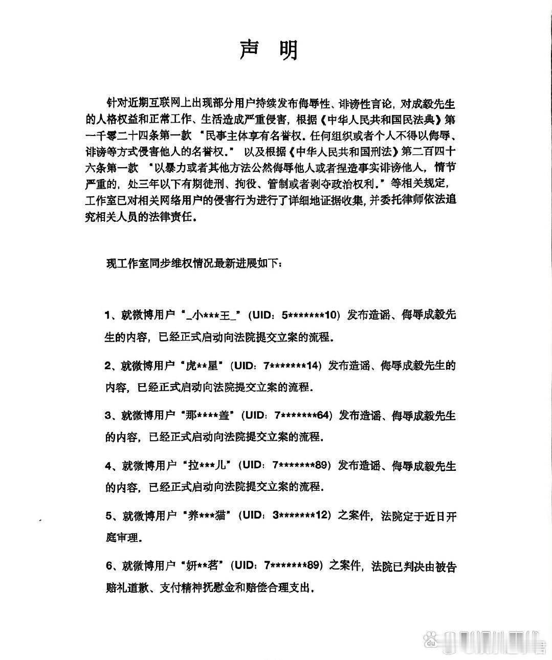 成毅工作室发布严正声明:针对近期互联网上出现部分用户持续发布侮辱性、诽谤性言论,对成毅先生的人格权益和正常工作、生活造成严重侵害。工作室已对相关网络用户的侵害行为进行了详细地证据收集,并委托律师依法追究相关人员的法律责任。并同步维权情况最新进展。