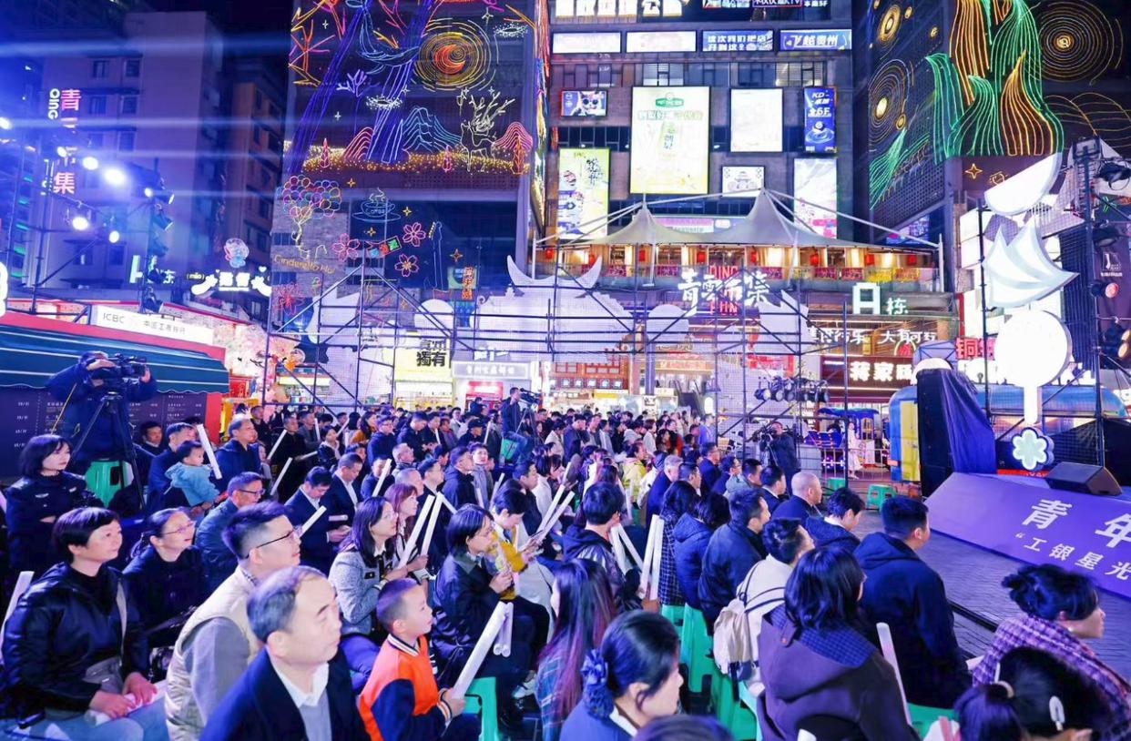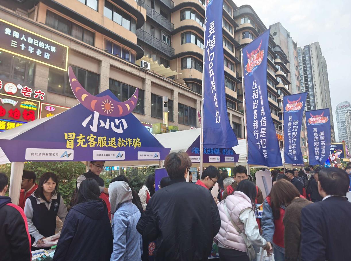 活动当天,“反诈十年青春有你”反诈主题公益音乐会在青云市集的夜色中同步开展,一首首改编反诈歌曲点燃着秋夜烟火,地戏的古韵新声,反诈小课堂的深入浅出,知识答题的热烈互动,都让反诈防骗的声音在热闹的市集人群中反复回响。网联清算公司的宣传小分队化身“反诈星火”,以青春脚步丈量城市脉搏,为商户和游客们送上精心编写反诈口诀,这条街巷成了城市中最生动的反诈课堂。