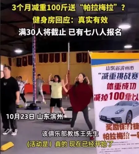 “减重 100 斤 = 开走帕拉梅拉!” 山东滨州这家健身房的海报刚贴出,全网瞬间炸了锅。更刺激的是规则:交 1 万报名费,进全封闭训练营,3 个月瘦够 100 斤,20 款保时捷直接过户。目前七八人已报名,名额满 30 就截止。