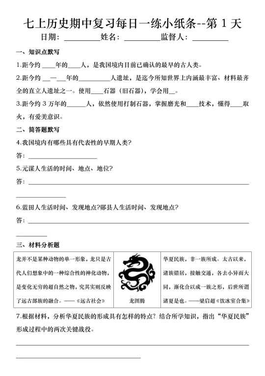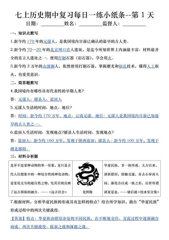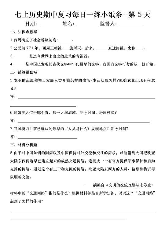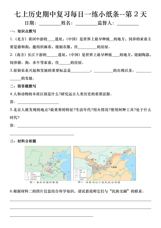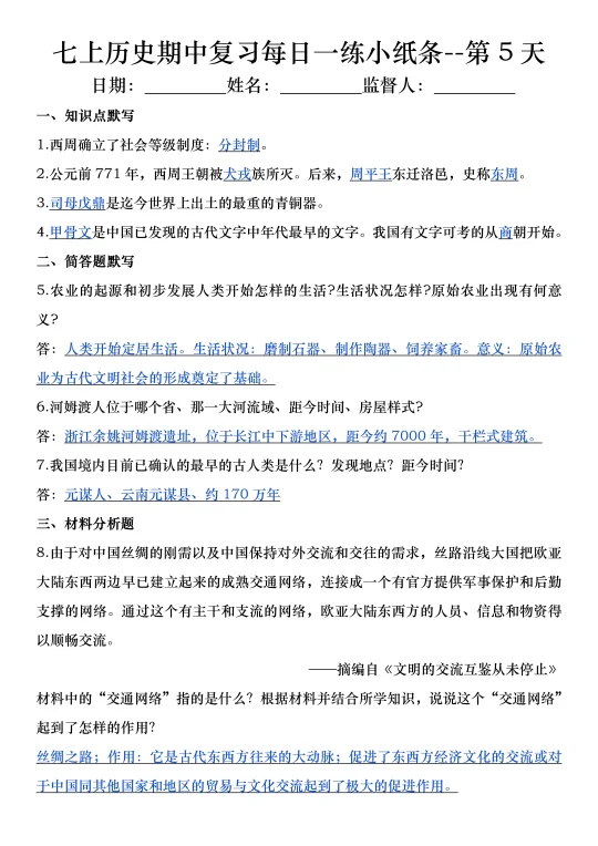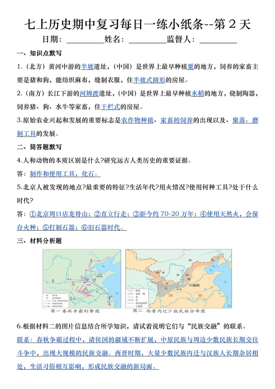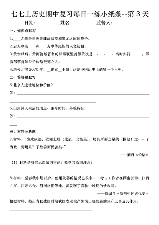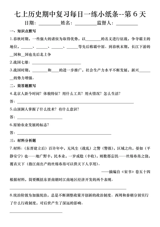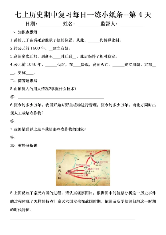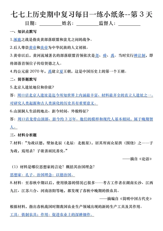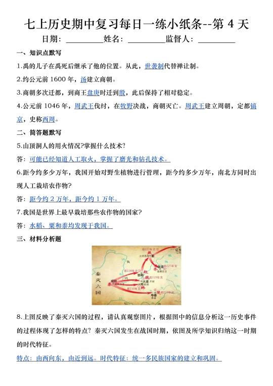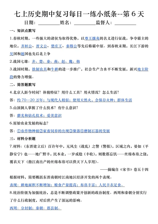 火箭班老师发的:七上历史期中复习小纸条