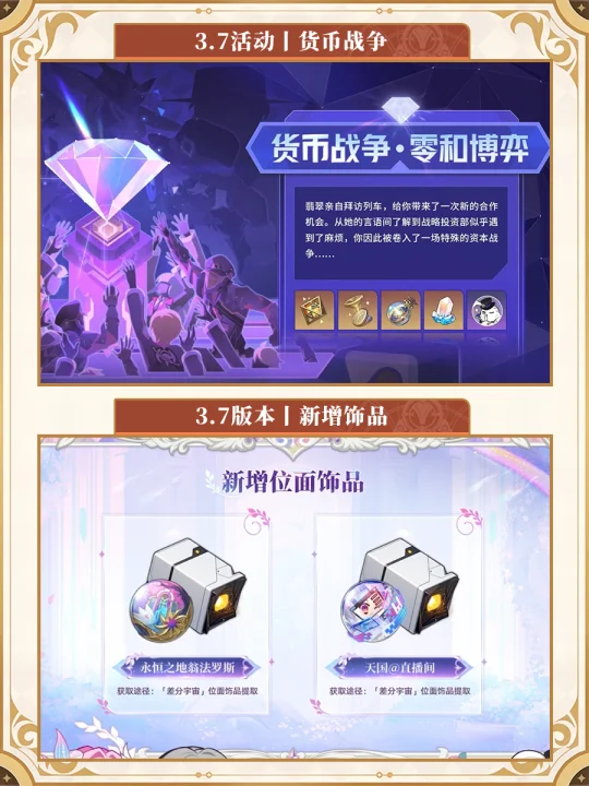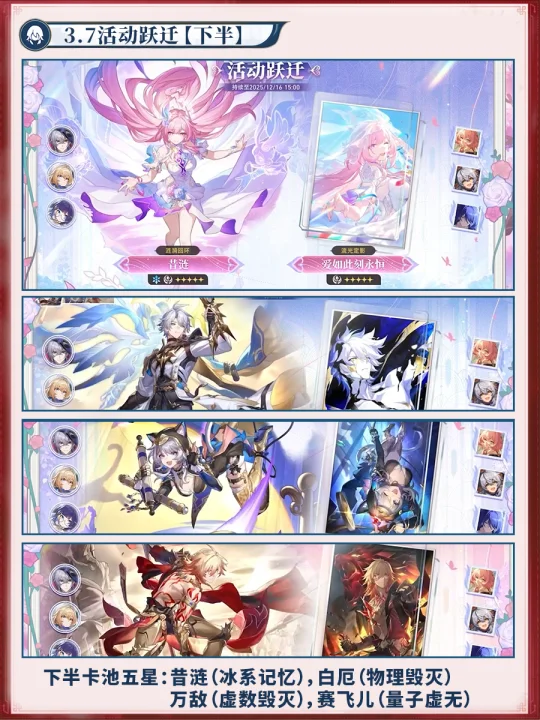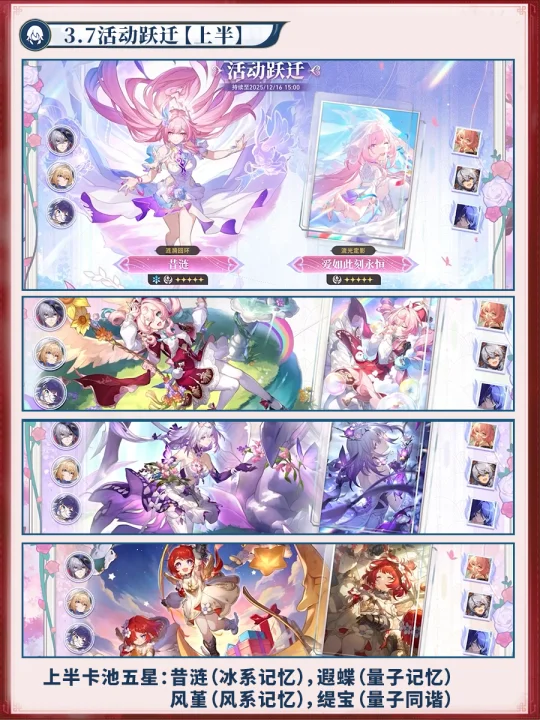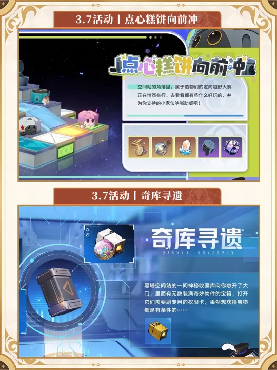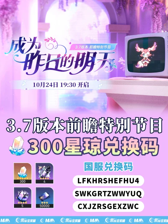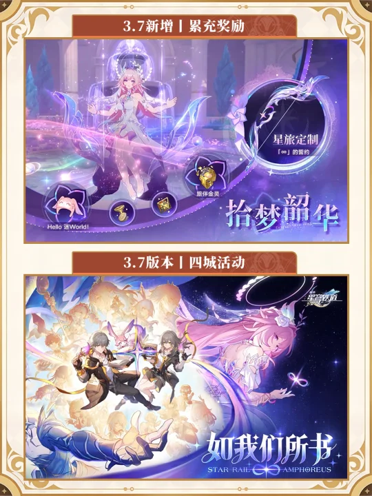 崩坏星穹铁道3.7版本前瞻300星琼兑换码,活动一览 星穹铁道送限定五星「旅伴金灵」 300星琼兑换码: SWKGRTZWWYUQ LFKHRSHEFHU4 CXJZRSGEXZWC 3.7版本卡池:(昔涟卡池持续一个版本) 上半:昔涟,遐蝶,风堇,缇宝 下半:昔涟,白厄,万敌,赛飞儿 活动: 1.货币战争 2.签到十连 3.点心糕饼向前冲 4.奇库寻遗 新功能: 1.新增托帕兑换 2.连续刷副本 3.开拓者时装