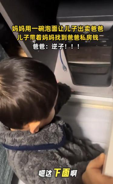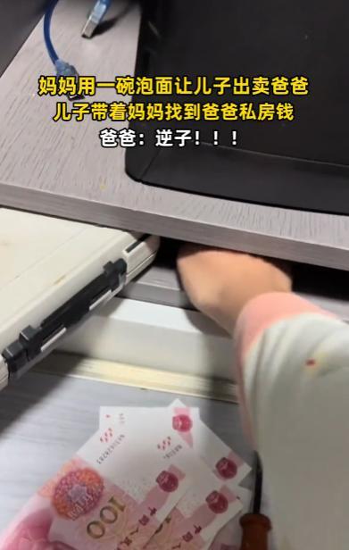 “笑不活了!”10月23日,江苏徐州,一男童被妈妈的一碗泡面收买,带着她找到了爸爸藏私房钱的地方,妈妈从柜子夹层找出一堆百元大钞,数了数得有小1000元!网友:小小年纪就当上了内鬼! 现在基本上都是家里的女人管钱,男人为了藏点私房钱绞尽脑汁,可花样再怎么多,也抵不住家里有个小“内鬼”! 一男童被妈妈投喂了一桶泡面,当然这泡面也不是白吃的,正当男童大快朵颐之时,妈妈在旁边询问他知不知道爸爸藏私房钱的地方在哪。 听到这个问题,正在吃面的男童小眼珠子一转,轻轻“嗯”了一声,妈妈见状有些惊喜,先是询问具体位置,怕男童描述不清,于是直接让男童带着她去找。 男童从凳子上下来,带着妈妈来到了电脑桌前,他指了指右侧的柜子,示意妈妈在这里,随后男童打开柜子,蹲下身来告诉妈妈钱就在这底下。 妈妈仔细摸索了一番,发现柜子底部竟别有洞天,底部的两块木板之间有个缝隙,她用螺丝刀撬开这条缝隙,夹层中全是百元大钞,妈妈将这些钞票全拿来出来,数了数得有个小一千元。 不少网友调侃男孩小小年纪就当上了内鬼,爸爸回家发现直接天塌了,不仅私房钱没了,还得跟妻子解释钱的来源和用途,“父子联盟”被妈妈用一桶泡面轻松瓦解! 信息来源:《妈妈用一碗面让儿子出卖爸爸,带妈妈找到爸爸私房钱,爸爸:逆子》观象视频