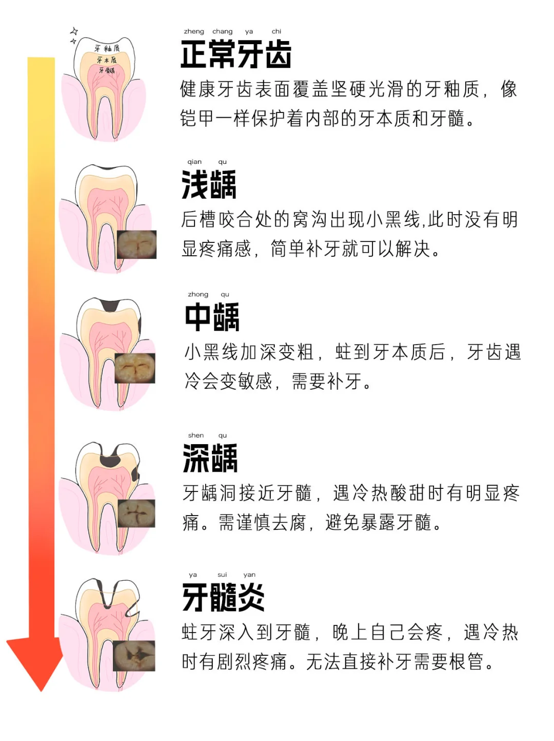 3️⃣后期(深龋): 细菌感染深入牙髓,引发牙髓炎。此时会出现自发性、阵发性的剧烈疼痛,尤其在夜间加重,可能需要进行根管治疗。