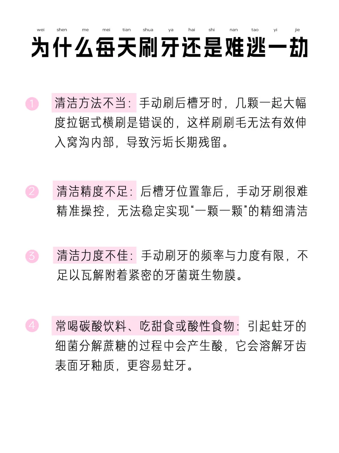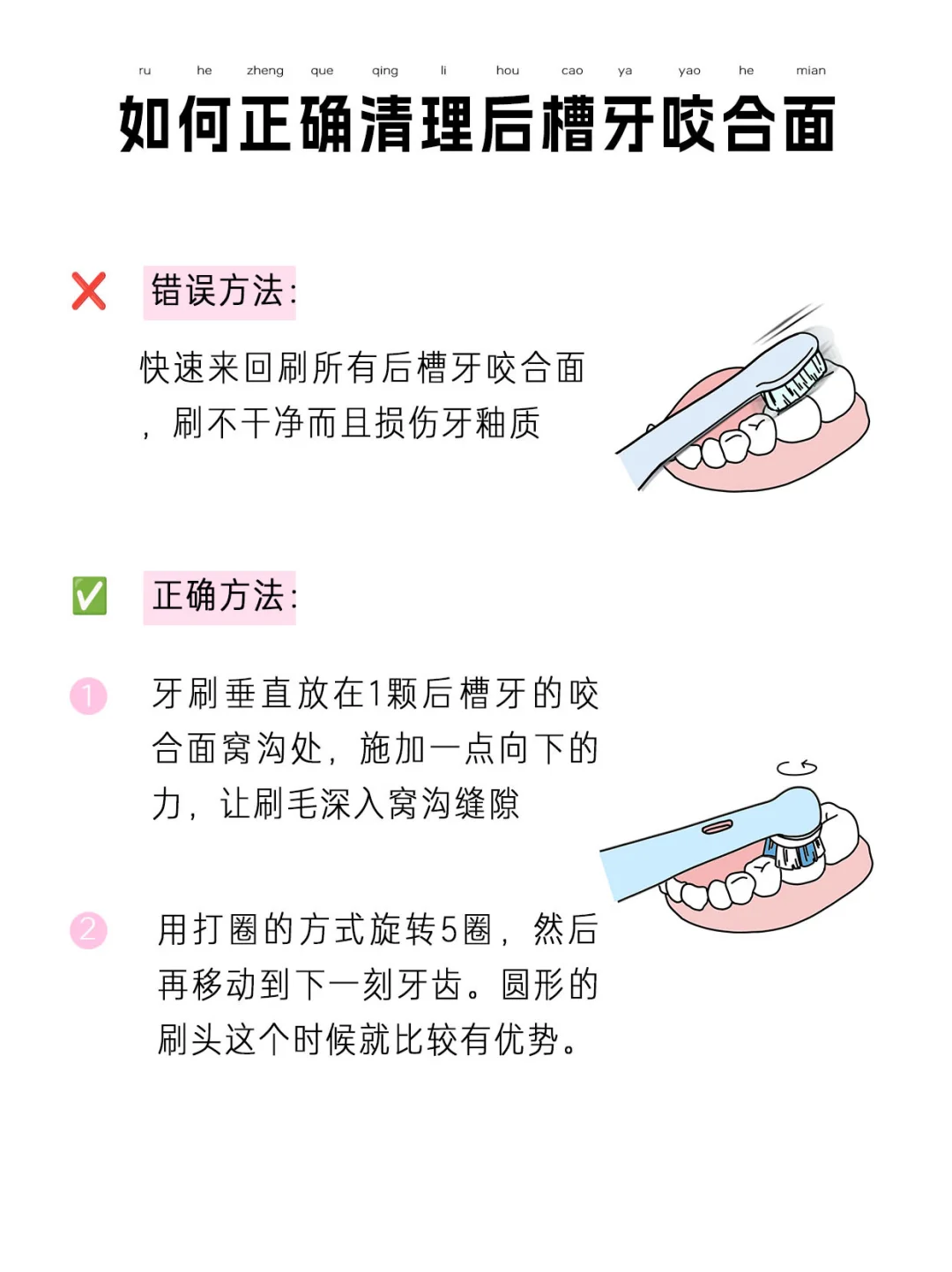 2⃣️清洁精度不足: 后槽牙位置靠后,手动牙刷很难精准操控,无法稳定实现“一颗一颗”的精细清洁。