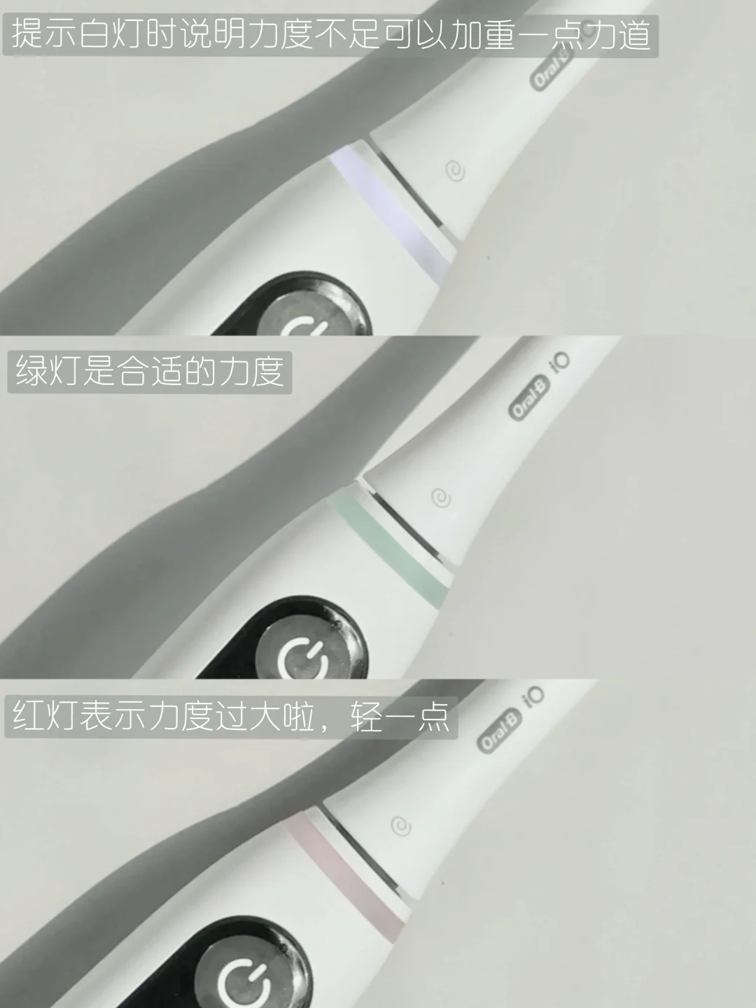 还有欧乐b自带的护龈灯,能够实时提醒刷牙力度:红灯亮起,代表力度太大;绿灯亮起代表力度适中,有效避免牙龈损伤,特别适合敏感时期使用,实现高效清洁与温和护理的平衡。