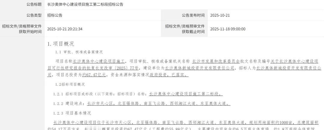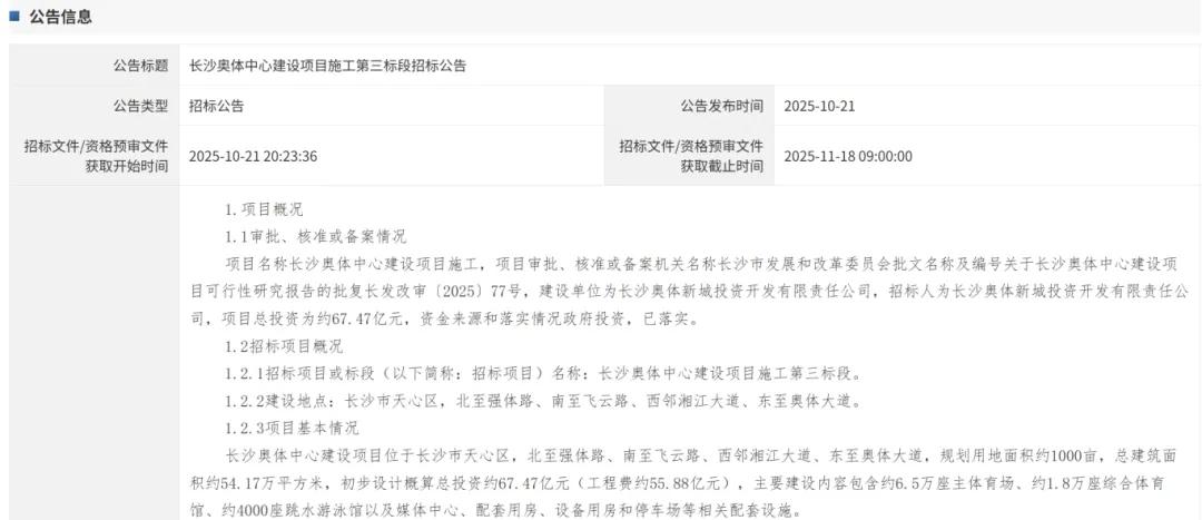 近日,长沙公共资源交易中心发布长沙奥体中心建设项目一至三标段招标公告。该项目位于