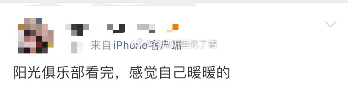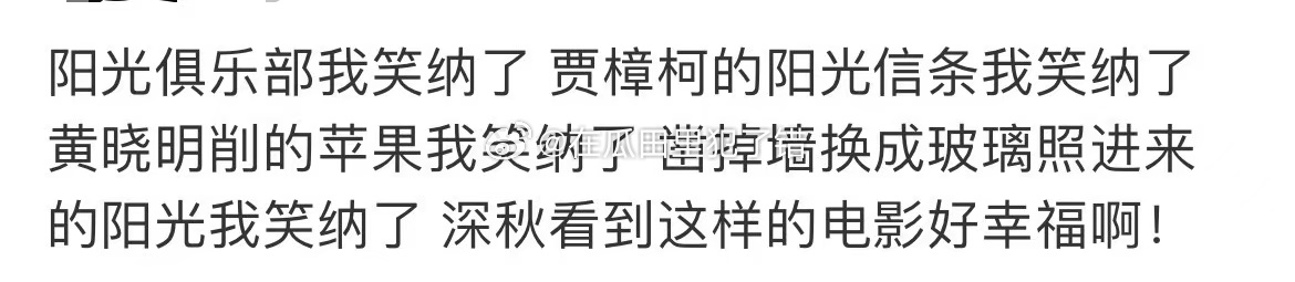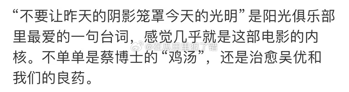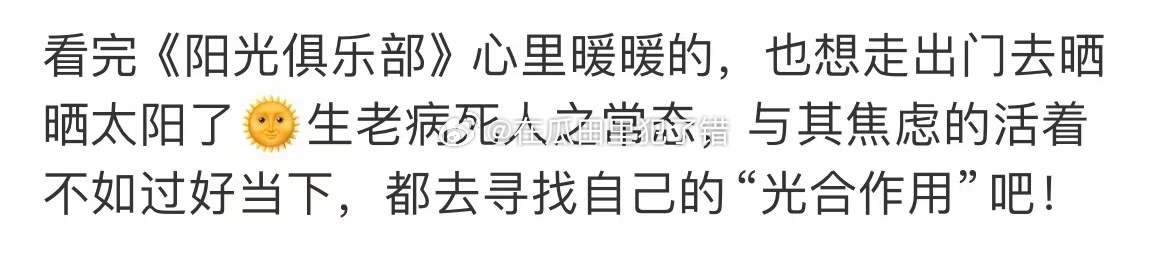 看完阳光俱乐部像吸了两吨氧 看完《阳光俱乐部》完全是精神吸氧,走出影院阳光洒在脸上感觉像蔡博士的“阳光能量”照进现实!!电影里有很多充满生活气息的自然幽默点,魏书钧真的很会拍,把底色悲凉的故事表现得轻盈又温馨。吴优的天真、妈妈和哥哥的包容、互相尊重的家庭……看完那句“don't worry be happy”一直在我脑袋里回响,感觉本就美好的周末更幸福了,值得n刷!!!