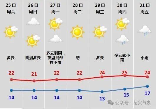 未来七日绍兴天气以多云为主,整体天气形势较为平稳,气温波动幅度较小,适宜开展各类户外活动。