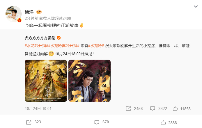 杨洋呼吁大家今晚共同关注柳眼的江湖故事,此外他还帮忙为方逸伦宣传《水龙吟》,一边