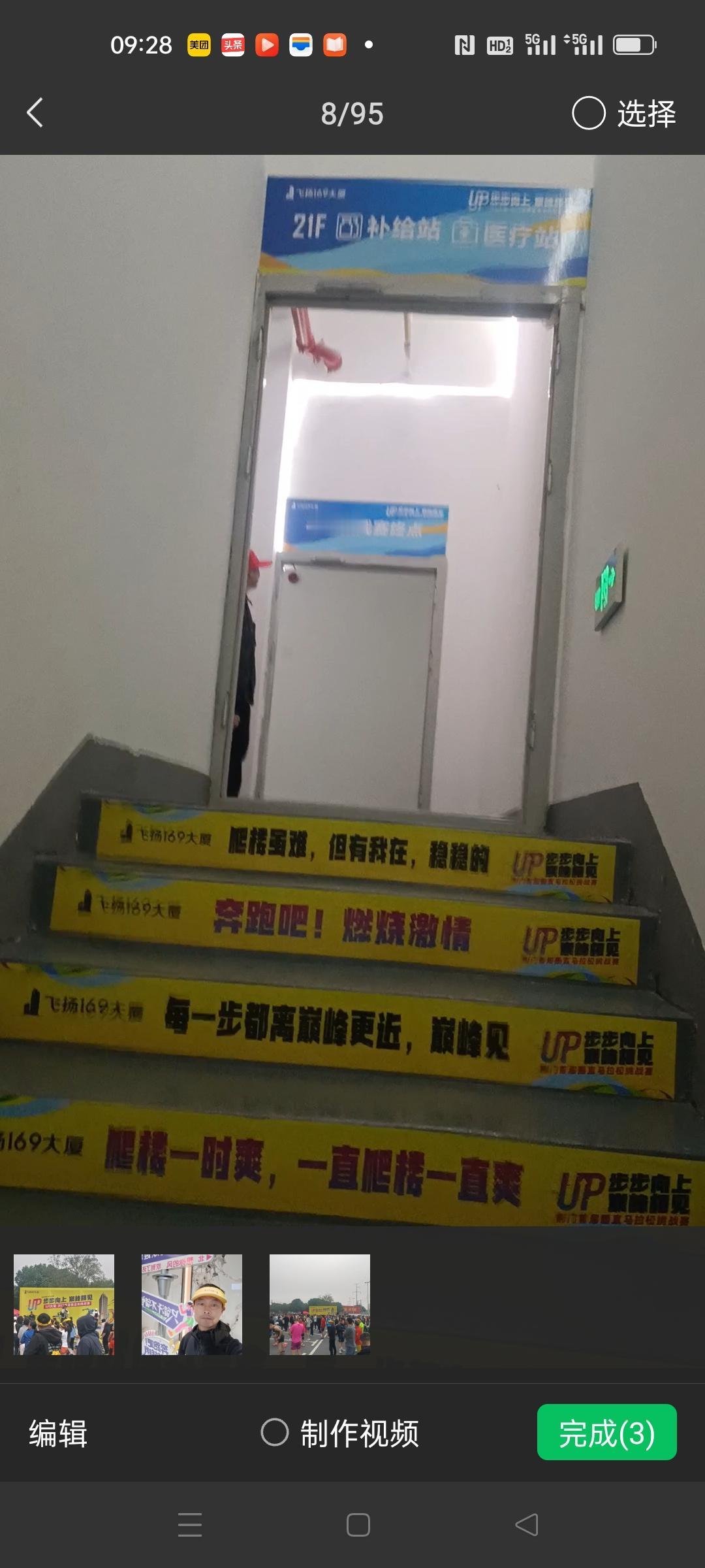 今天去参加169大厦垂直马拉松 其实就是爬楼梯,一共34层 来的时候信心满满 , 听说前20名都有奖 准备冲刺一下 谁知道啊,爬了10楼就不行了 腿都发抖,跑是跑不成 只能一步步跨上去 最终气喘吁吁9分多钟完赛 什么名次都没有 看来还是高估自己 以后还是要实实在在训练 争取明年拿名次