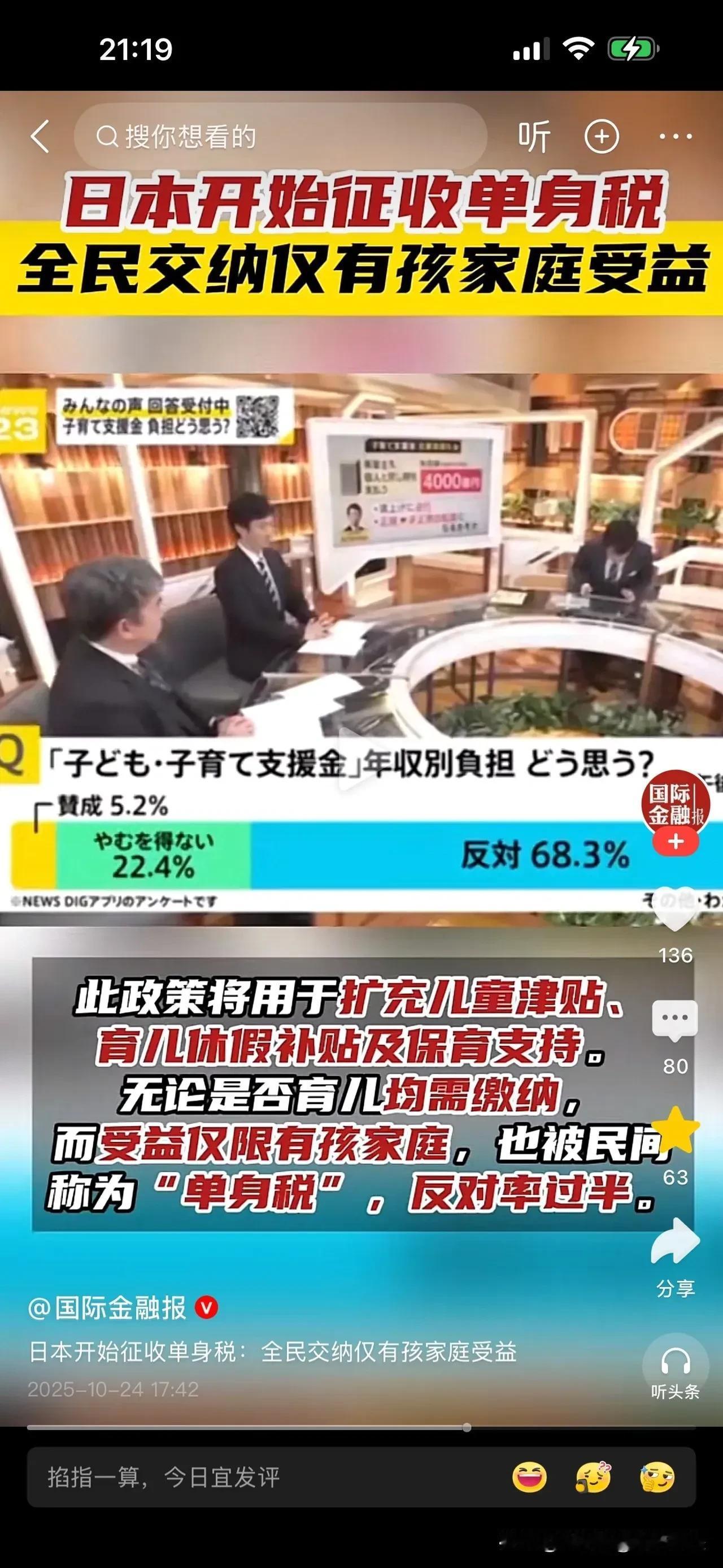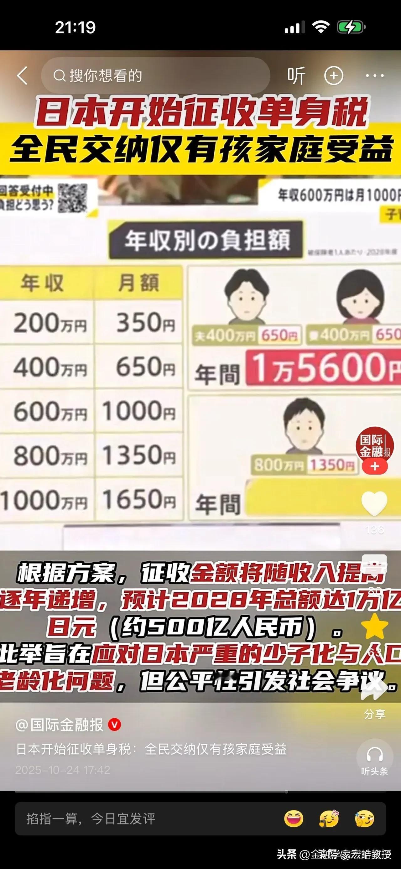日本在收税这方面真的是毫不含糊,从现在开始要向全民收“单身税”了,收上来的钱全部给生育孩子的家庭发补贴,这是举全国之力养育日本的下一代啊! 日本从现在起要向全体缴纳健康保险者收每年120-600元人民币的税,随着收入提高逐年递增至200-920元人民币,无论是否育儿,大家都要交,类似“单身税”,但也不全是。受益者仅仅是育儿家庭。虽然日本有68.3%的人反对,可是日本依然推行这个政策来应对日本少子化的冲击。
