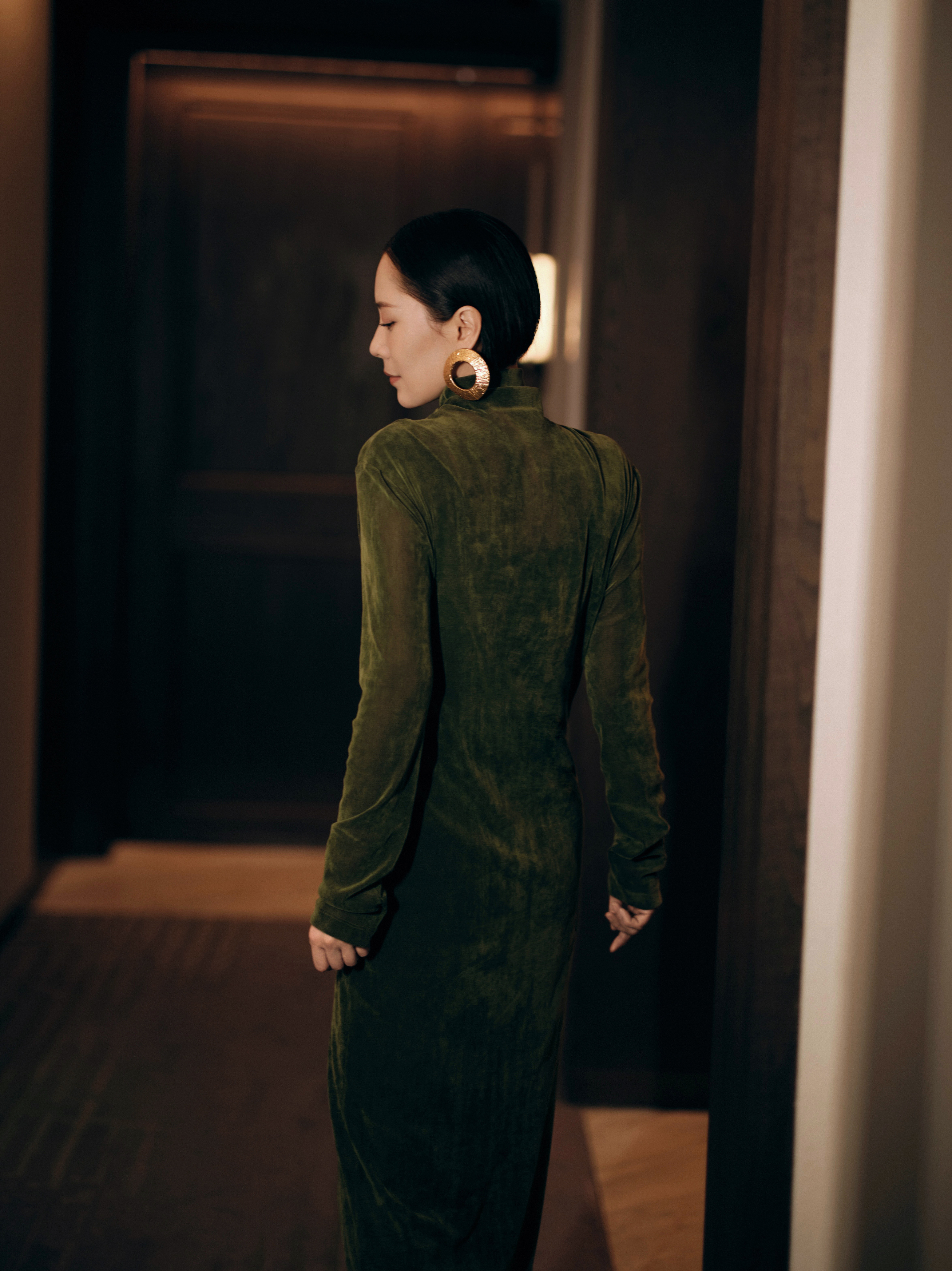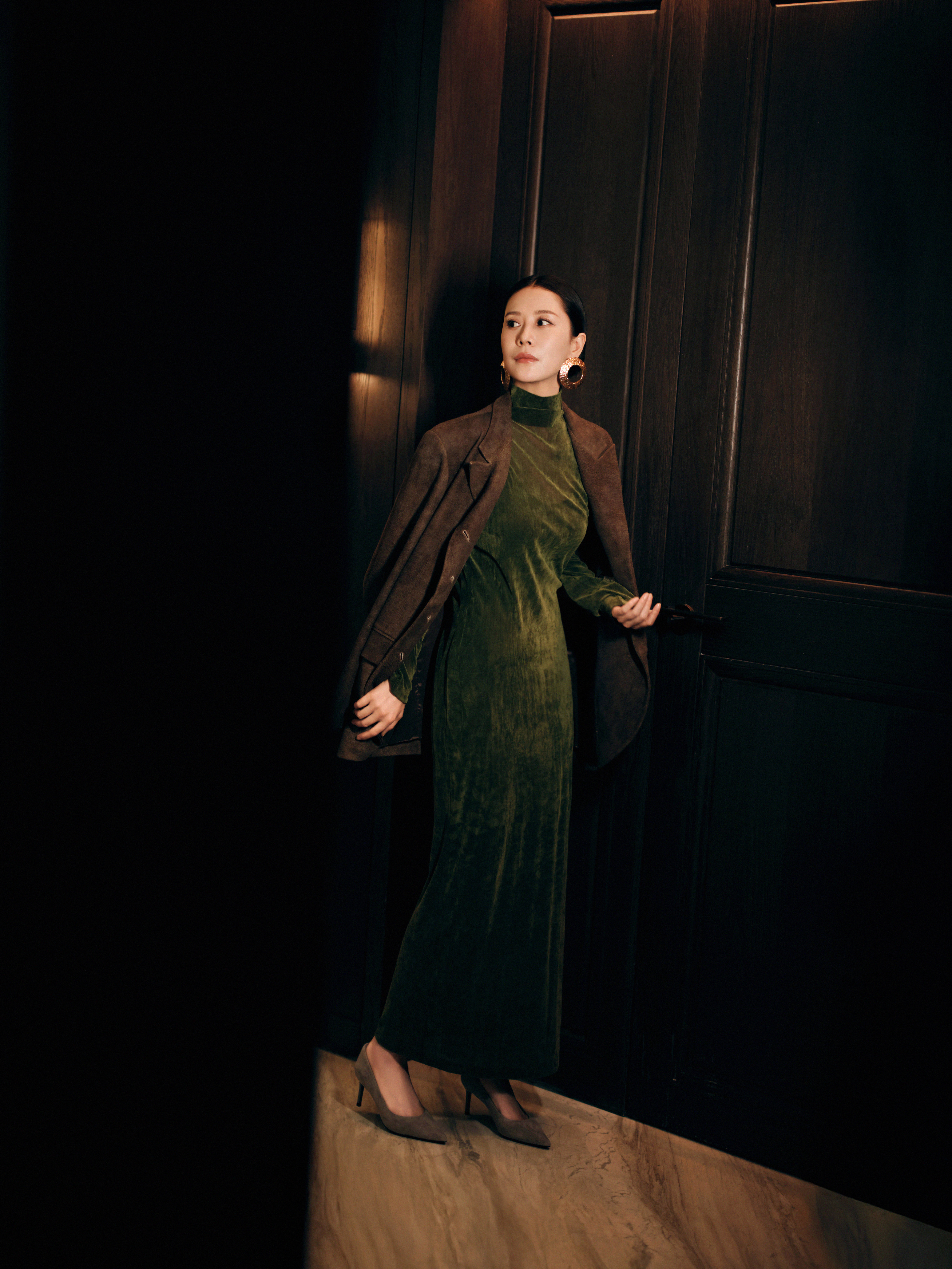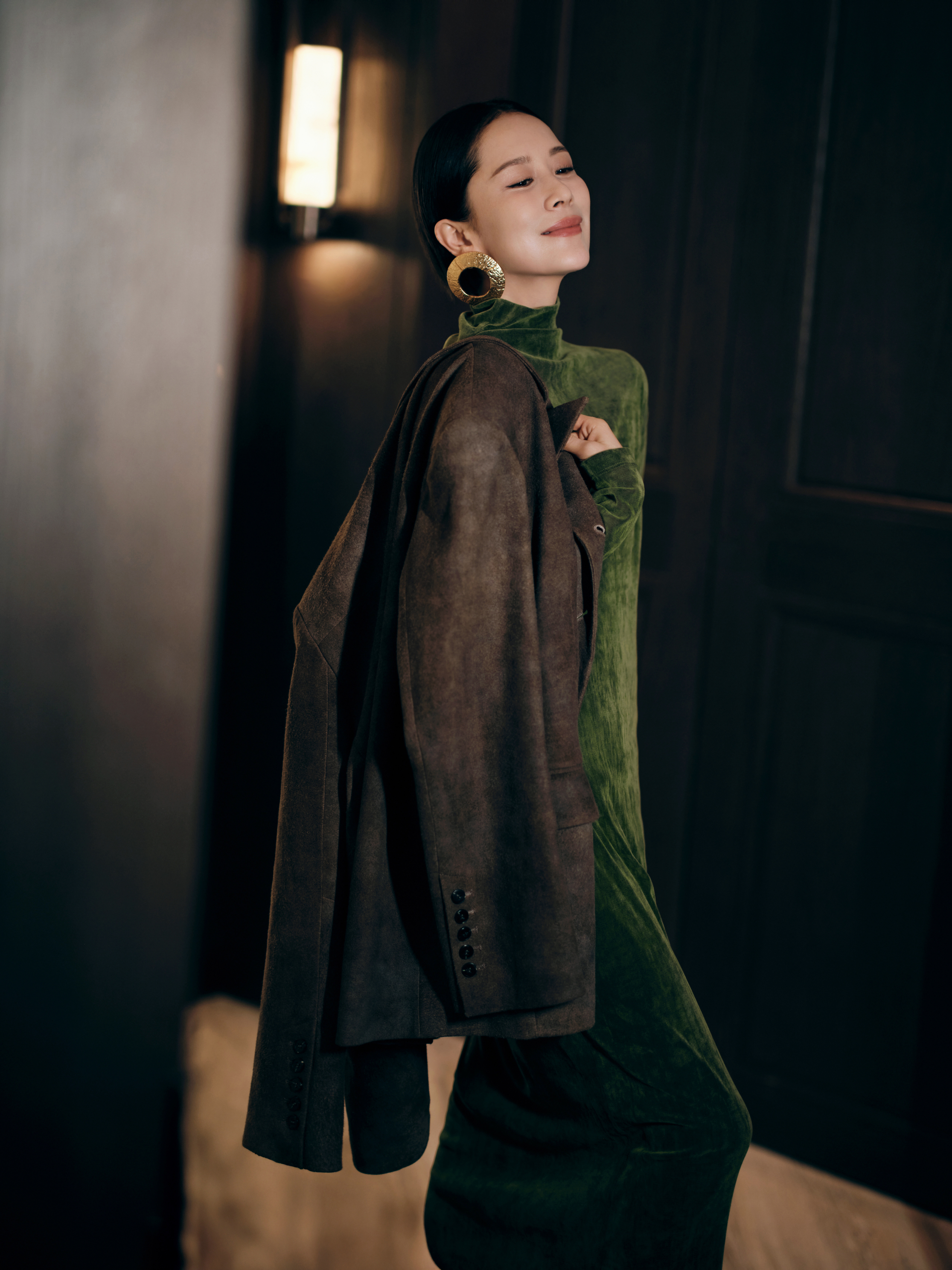 海清一袭复古棕麂皮西装搭配墨绿色丝绒长裙亮相ZHUCHONGYUN 活动现场,沉静神秘的墨绿质感呈现温柔知性的复古风格,衬托出海清从容干练的气场,撞色穿搭的优雅典范,整个高级感拉满,姐这状态也太顶了!