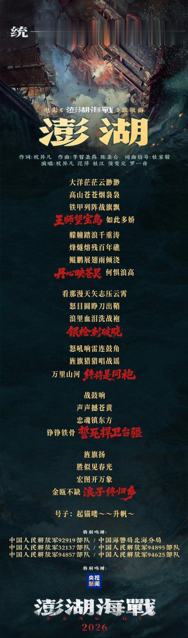 电影《澎湖海战》由王海峰任总制片人,郑保瑞监制并执导,杜家毅监制并编剧,王学圻、杜江、侯雯元、罗一舟领衔主演,易烊千玺特别主演,电影将于2026年上映。