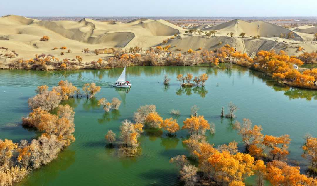 10月25日,新疆巴音郭楞蒙古自治州尉犁县葫芦岛景区,人们乘船观赏大漠胡杨景色。