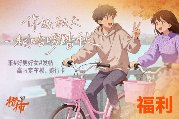 福利:综合发帖内容、发帖数、发帖阅读总数,选出3位橙友,每人送出哈啰限定粉色单车车模一个,价值200元;再选出20位橙友,每人一张哈啰骑行月卡。