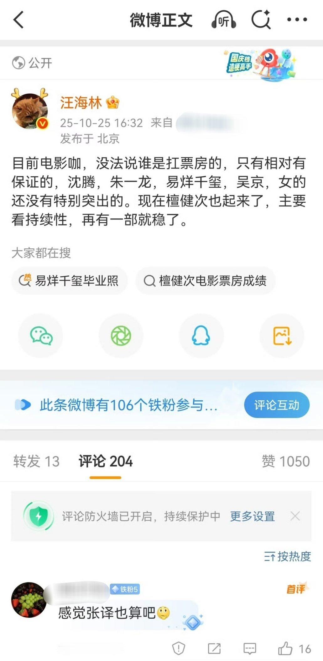 汪海林说目前能保证电影票房的男演员🈶沈腾、朱一龙、易烊千玺、吴京,现在檀健次也起来了。