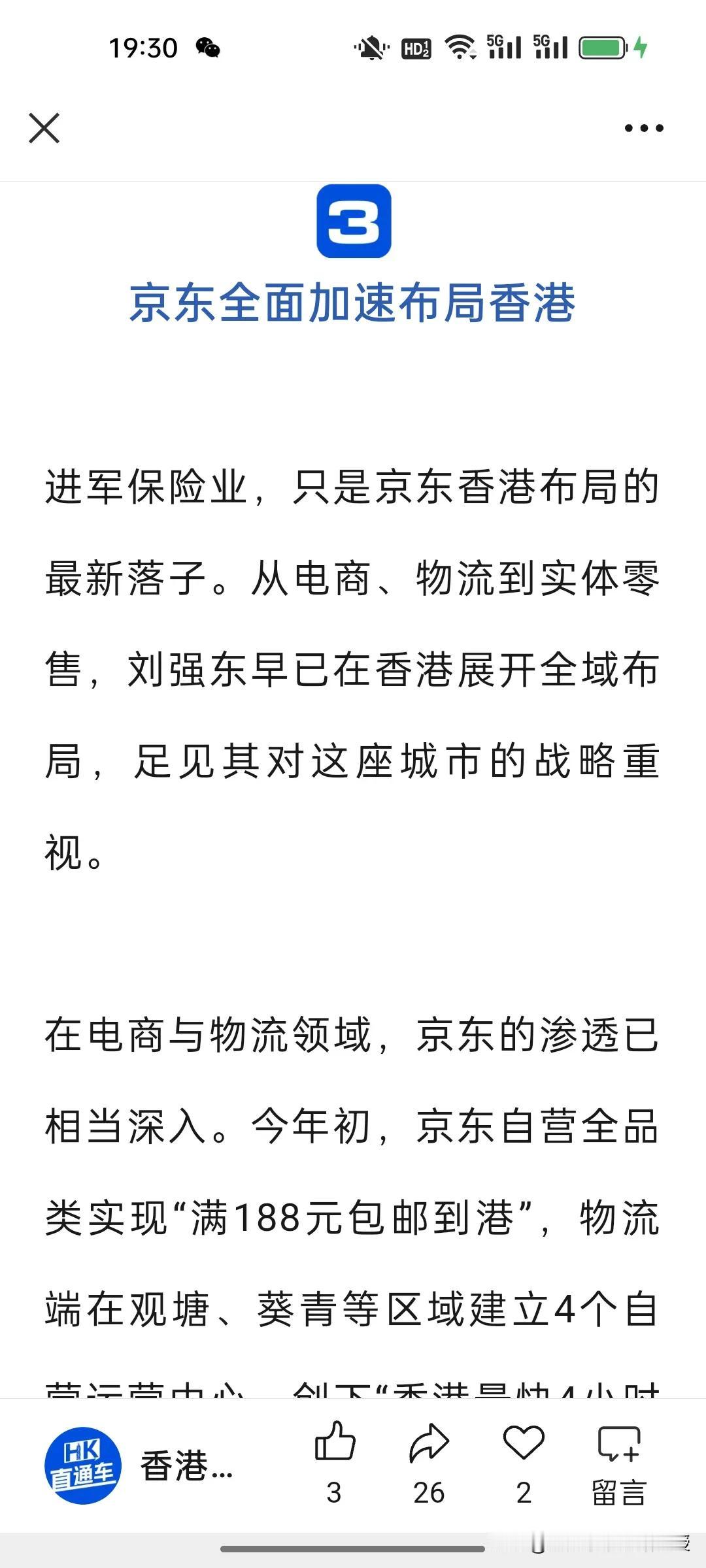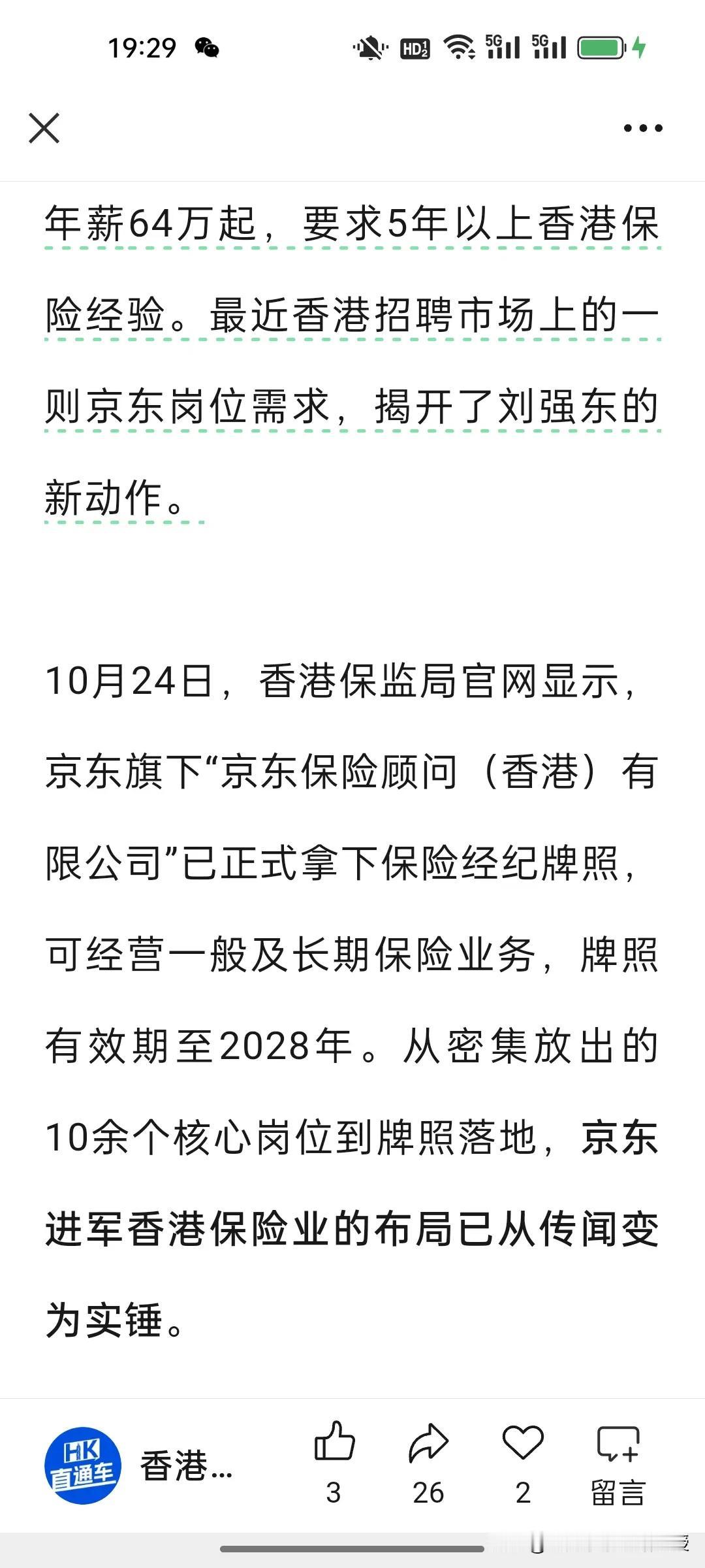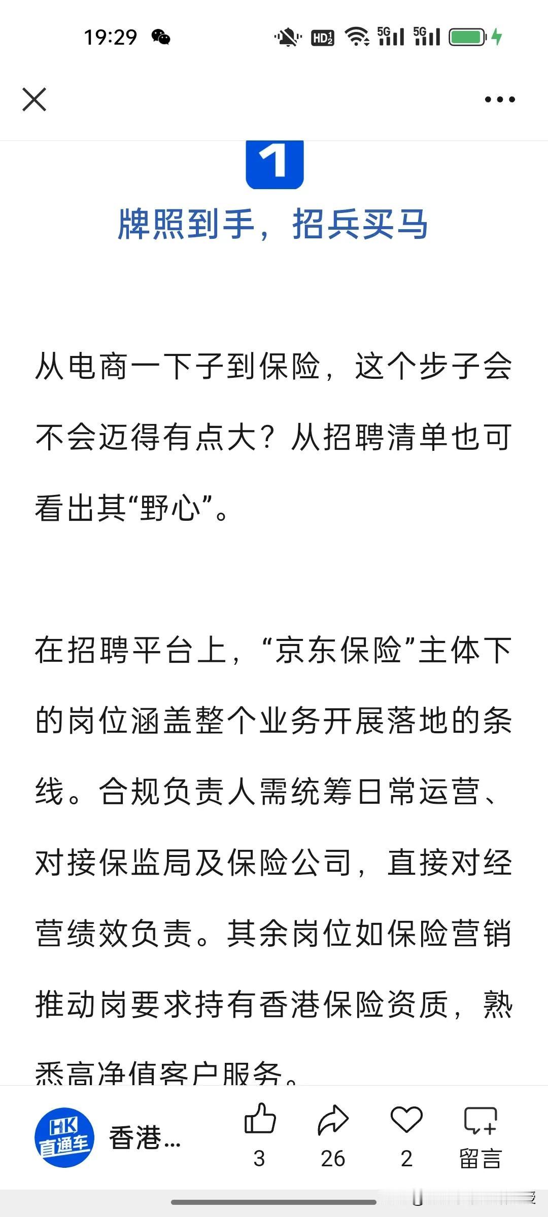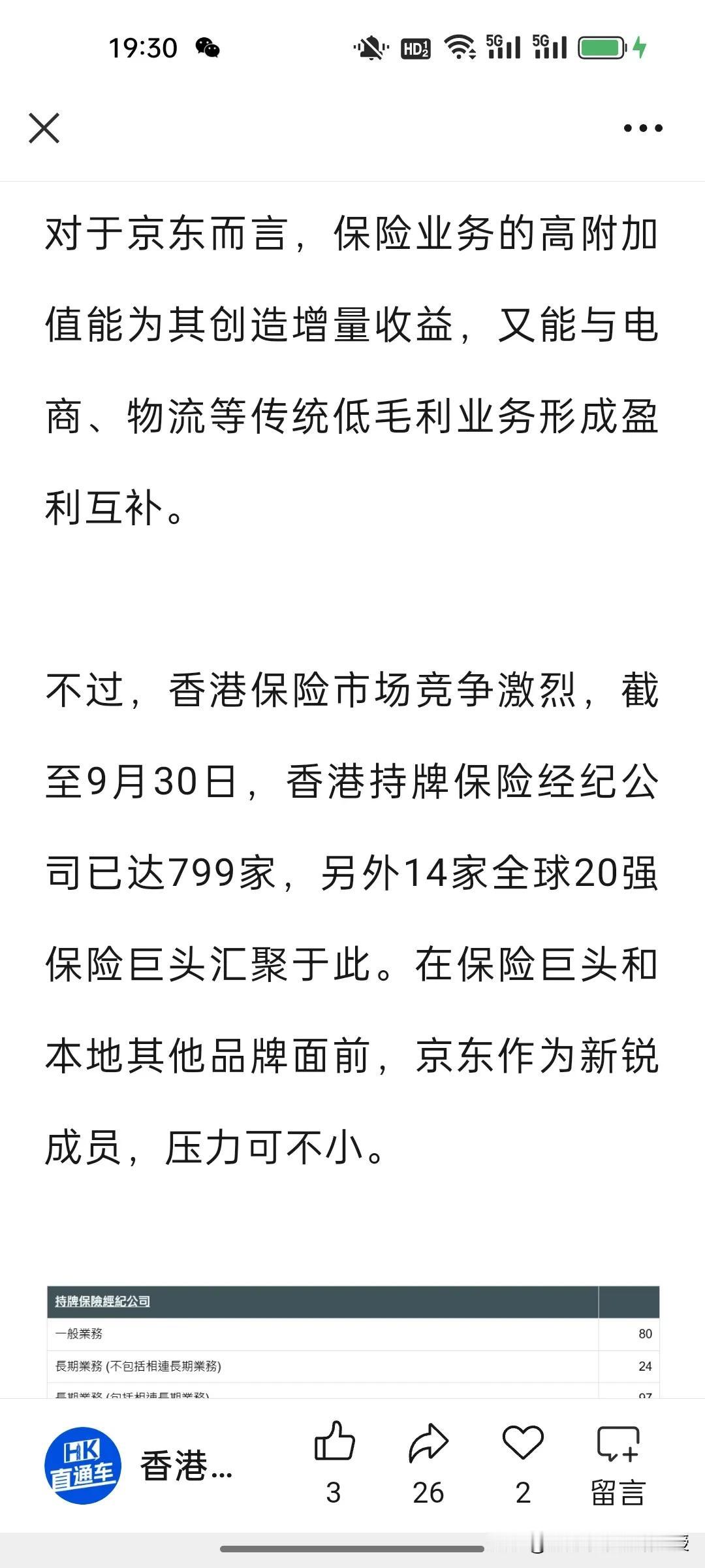 原来京东入局外卖只是“开胃菜”,最近京东大动作不断,先与宁德时代,广汽集团合作造“国民好车”,刚刚又拿下香港保险经纪牌照,进军香港保险业,这可是千亿元的大生意。 今年上半年,香港保费就高达4200亿,新造保单比去年同期增加50%,友邦保险在香港占据了35%的份额,利润率更是高达57.7%,是名副其实的保险行业老大,此次京东果断入局香港高利润的保险业,能对物流,快递等低利润的行业形成互补。友邦保险一家独大的局面或被改写。 京东前期刚刚收购了香港佳宝超市,双十一更是推出99元全港包邮送货上门的大力度优惠措施,这些在香港的深入民心的操作更是为进军保险业务打下伏笔。 京东今年跨界不断,确实在为成为“全域经济服务体”快马加鞭。
