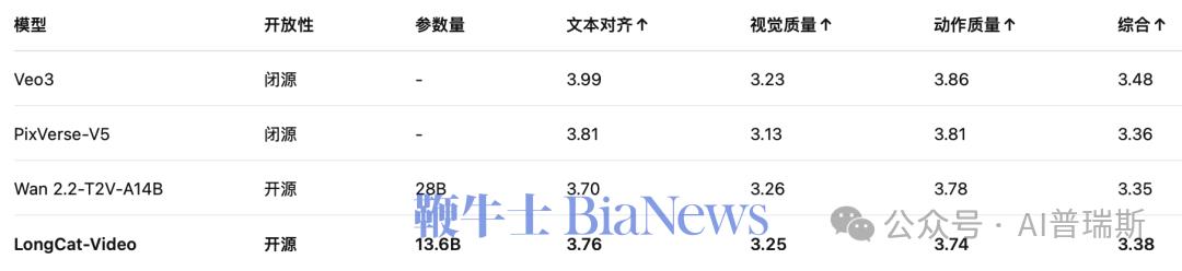 在参数量仅一半的情况下,LongCat的综合表现已追平Wan2.2系列。