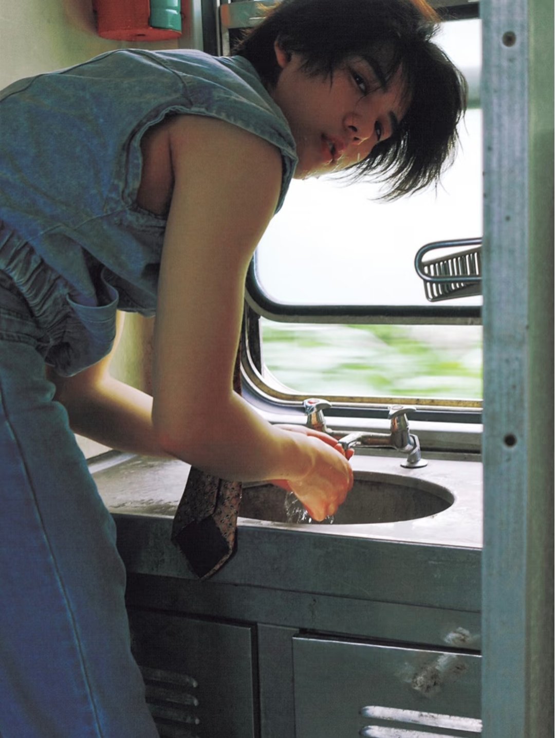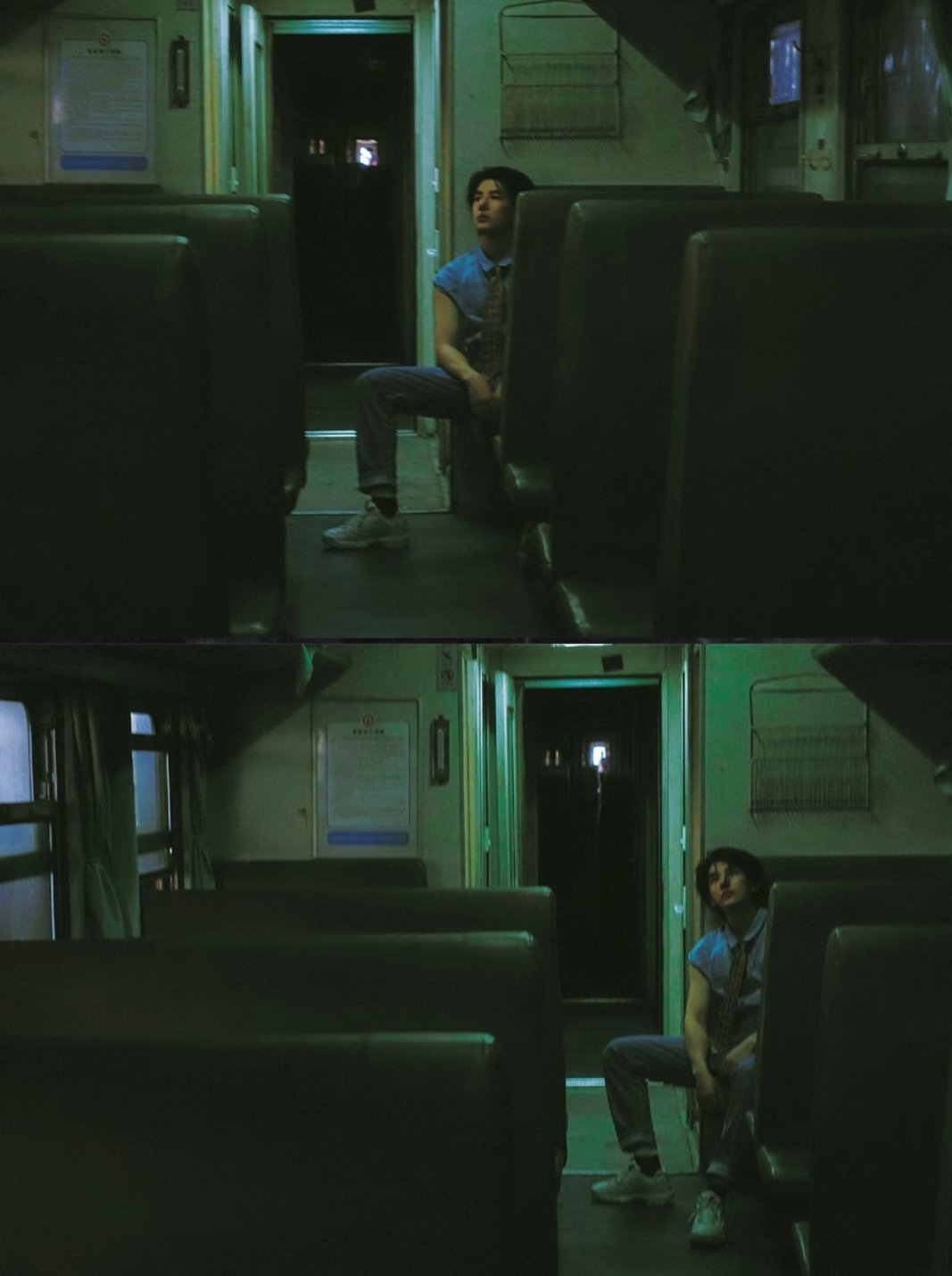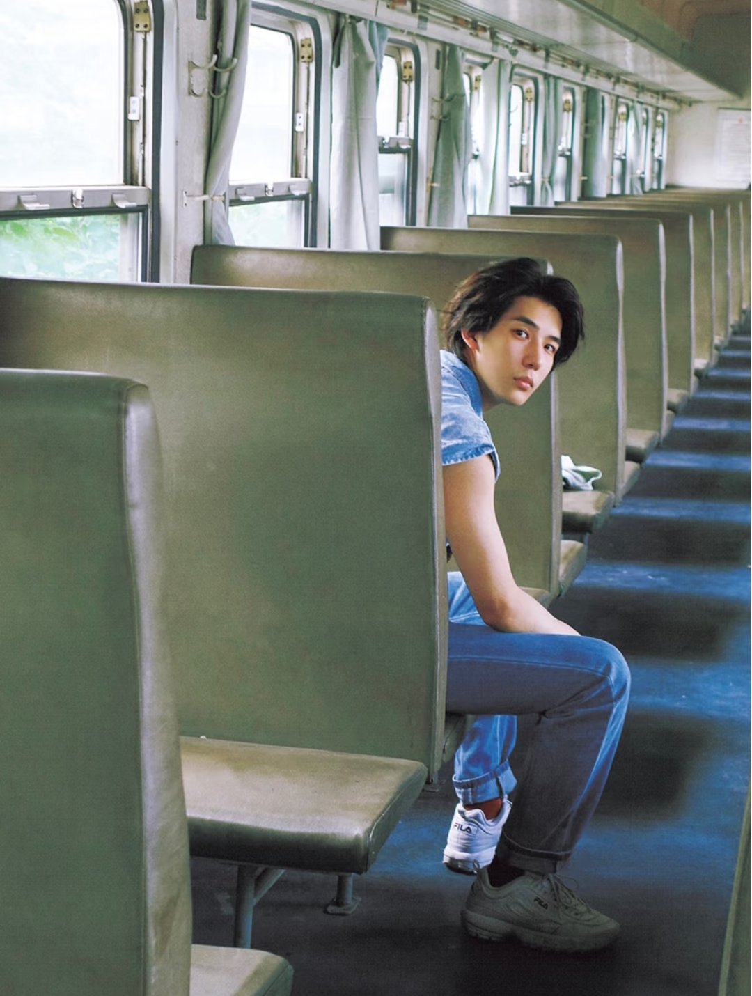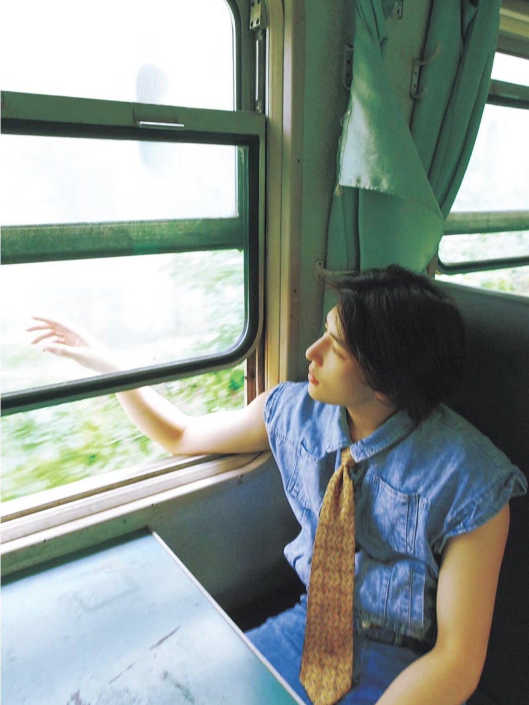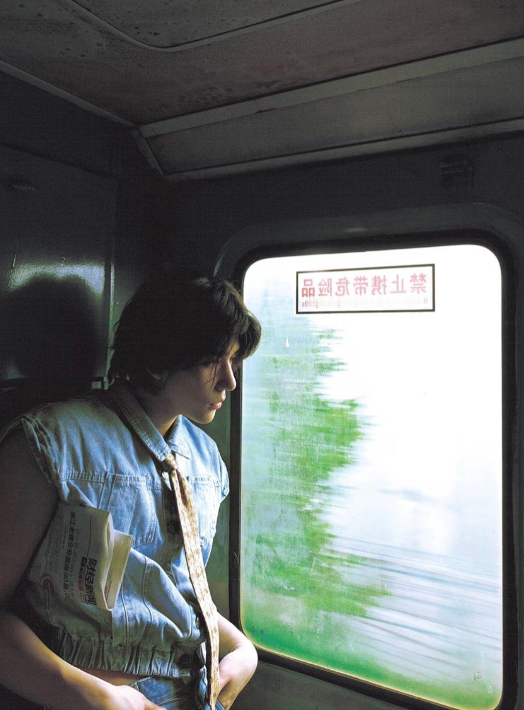 王安宇一组在列车上的图片,长刘海发型和怀旧穿搭太有文艺气息了~