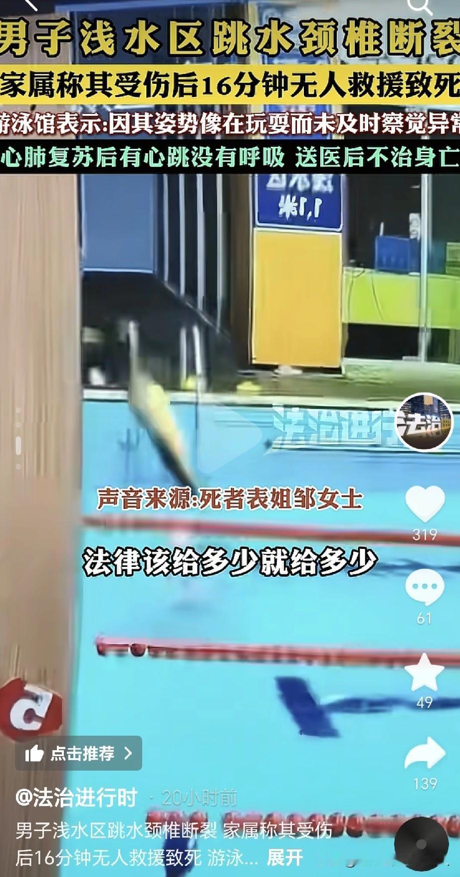 浙江宁波36岁男子跳水后颈椎断裂去世事件,目前双方有了回复。首先,男子表姐接受采访说:知道表弟有责任,1.1米深的水池,不可以跳水,但也要走法律途径去维护一下权益,该给多少就给多少,假如最后判定一分钱不赔偿,也能接受。 其次,游泳馆负责人接受采访说:男子是在我们这里出的事情,大家都很难受,一个大活人就这么没了,补偿肯定会有,但具体多少,要看法律判决。 通过以上信息,可以看出双方都奔着解决事情的态度在努力,这点很不错,也算给各自内心找一份“安慰”吧。 相信这件事过后,给全国所有游泳馆的安全员一个提醒,不能主观意识判断是否危险,一定要第一时间亲自下水去查看,这也是对生命负责。 除此之外,还有一件事要引起注意,7岁女儿目睹了爸爸离开的全部过程,没有及时喊别人来帮忙,间接错过了最佳治疗机会,要抓紧找一个专业的心理疏导师,否则会自责走不出来,影响以后的学业,工作,甚至婚姻呀。