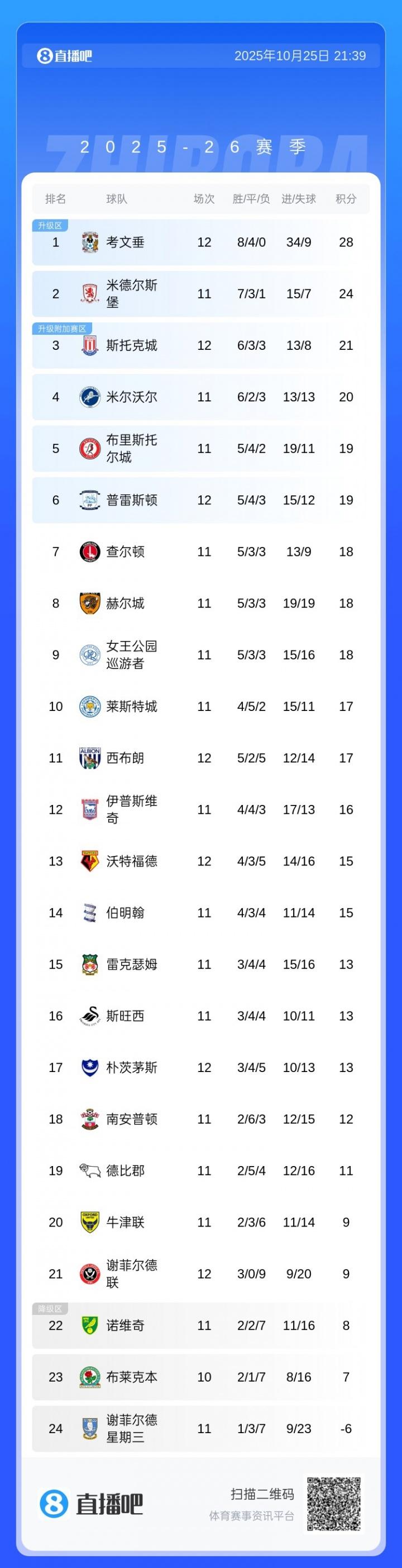 考文垂已经高出第3名斯托克城已经7分之多,成为目前英格兰四级联赛中唯一一支不败的球队。