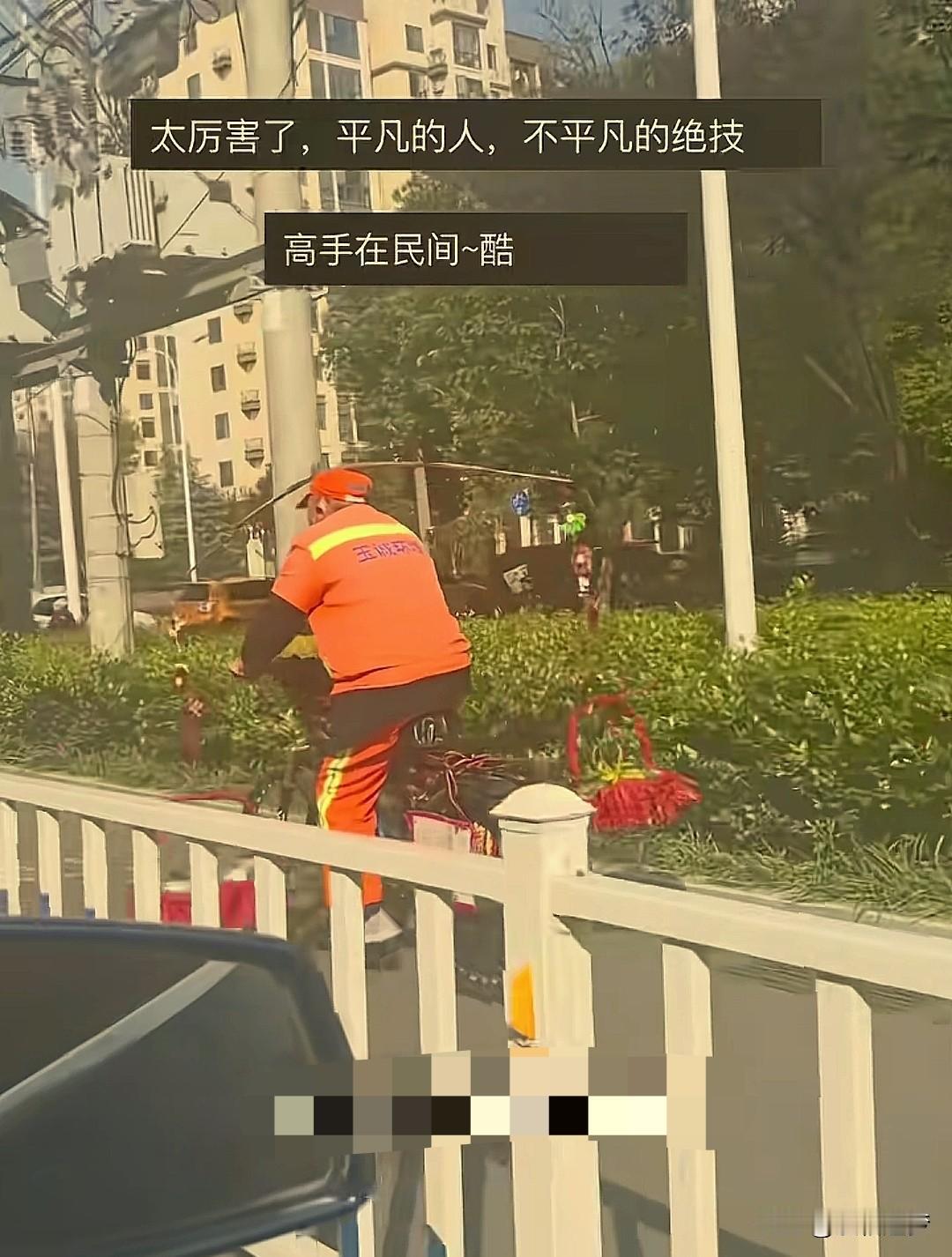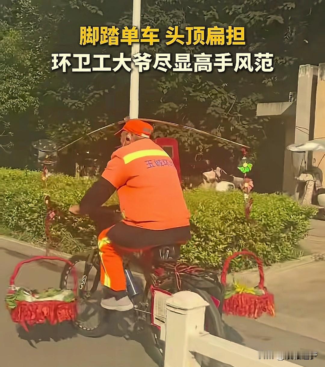 “高手在民间!”安徽阜阳,一女子开车时,发现路边惊现神 奇一幕:一位大爷头顶扁担挑着两筐菜,骑着自行车稳如泰山的驶了过去,女子看呆了,大爷这绝活堪比杂技演员,直到自行车远去女子也没想出是怎么做到的。 这年头,走路挑扁担都不常见了,突然遇到一个骑自行车挑扁担的,真是闻所未闻。 根据新 华社10月23日报道,这件有趣而又让人佩服的事,就发生在马路边上。 视频里,大爷头上戴着一顶十分普通的帽子,那条竹扁担稳稳的搭在脑袋上,下方是两只装满了菜的菜篮子悬在自行车两侧,装饰格外喜庆,而这条扁担就跟“粘”在了他帽子上似的,更像是拥有了平衡术,任凭他骑得飞快,扁担跟着节奏晃动,不偏不倚,更没掉下来。 再看大爷的一身环卫服的行头,显然是一位环卫工人,女子差点难以置信,一位普通的不能在普通的人,会有这样的“绝技”!不由得心生佩服。 女子将这一幕发到了网上,还感叹道:“平凡的人,不平凡的绝技,谁能想到这要练多久!” 网友看了纷纷夸赞大爷。 有人说:这平衡感不得了啊,大爷年轻时估计更厉害! 也有网友解释称:当地有一个杂技小镇,这个扁担看起来很轻,筐里离老远看过去像是菜,但也有可能是道具,这大爷很可能是退休的杂技艺人! 其实无论大爷扁担里是道具还是蔬菜,就他这稳当劲,可不是一两天的功夫,一般人还真模仿不来,老一辈人对于钻研技巧那种韧劲,一看就是真本事。
