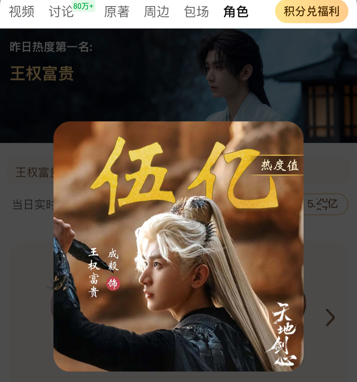 全体起立,成毅天地剑心🥝首日热度破8000达成佳片殿堂,王权富贵角色热度破5亿
