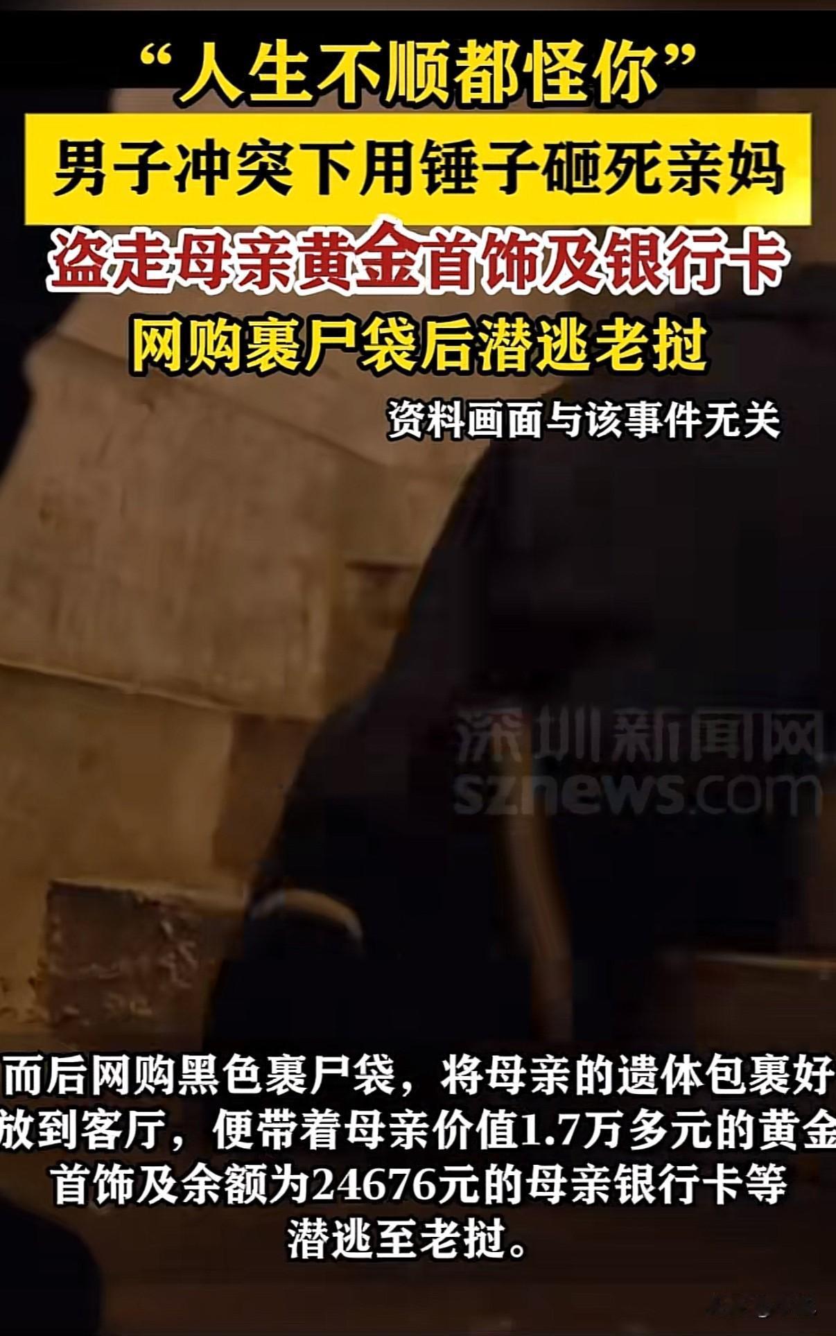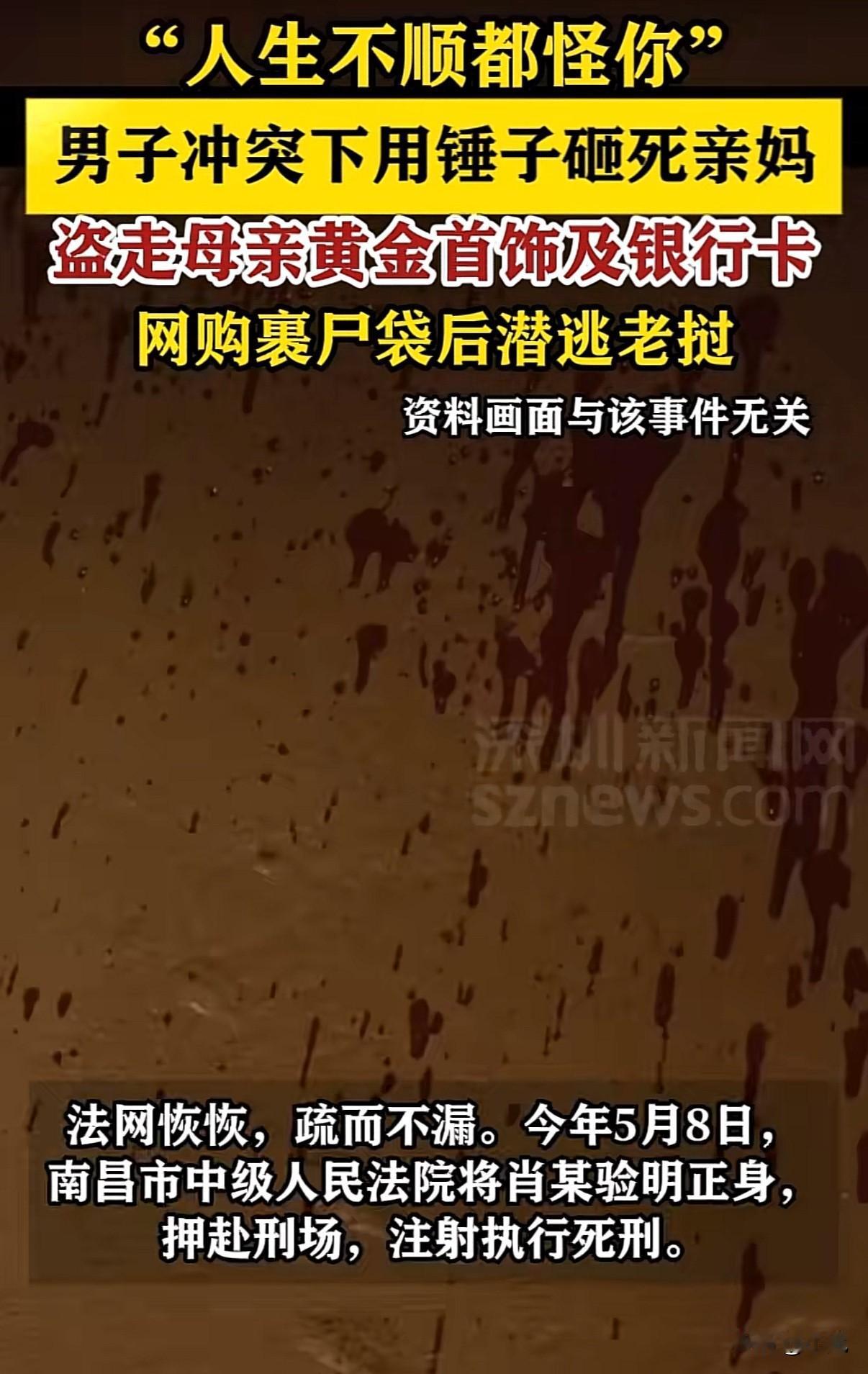 “毫无人性”!1985年出生的肖某,大学毕业后一直没工作。 他和67岁的母亲王某某住在南昌的租住房里。 2023年5月14日中午,母子俩在租房里聊天。 聊天变成争吵。 肖某拿起锤子,连续击打母亲头部。 母亲因颅脑损伤死亡。 行凶后,肖某做了三件事。 他上网订购了一只黑色裹尸袋。 他翻找母亲的首饰盒,取出7件黄金首饰,价值一万七千多元。 他找到母亲的存折和银行卡。 裹尸袋到货后,他把母亲遗体包裹好,放在客厅。 5月15日,他去银行取了存折里的10.02万元。 5月17日,他又想转存单里的钱,但只转出1000元。 母亲银行卡里还有两万四千多元,他没来得及取。 带着黄金首饰和取出的现金,他逃往老挝。 这个案子有几个细节让人难以理解。 一个受过大学教育的人,怎么会对生养自己的母亲下此毒手? 作案后还能冷静地网购裹尸袋、翻找财物。 更讽刺的是,他盗取的金饰和存款,很可能都是母亲省吃俭用攒下的。 法院判决指出,肖某长期将人生不顺归咎于母亲。 但一个40岁的成年人,把自己的失败全部怪罪于父母,这种逻辑本身就很可悲。 杀害直系亲属,盗窃财物,潜逃境外,每一条都触犯法律底线。 2025年5月8日,肖某被注射执行死刑。 从作案到伏法,不到一年时间。 法律给了公正的审判,但留给世人的思考很多。 为什么亲情会演变成仇恨? 为什么高等教育没能教会他做人的基本良知? 最可悲的是,母亲含辛茹苦把孩子培养成大学生,最终却死在孩子手中。 这起案件让人背后发凉。 它不仅是一桩谋杀案,更是一个关于教育、人性和亲情扭曲的悲剧。