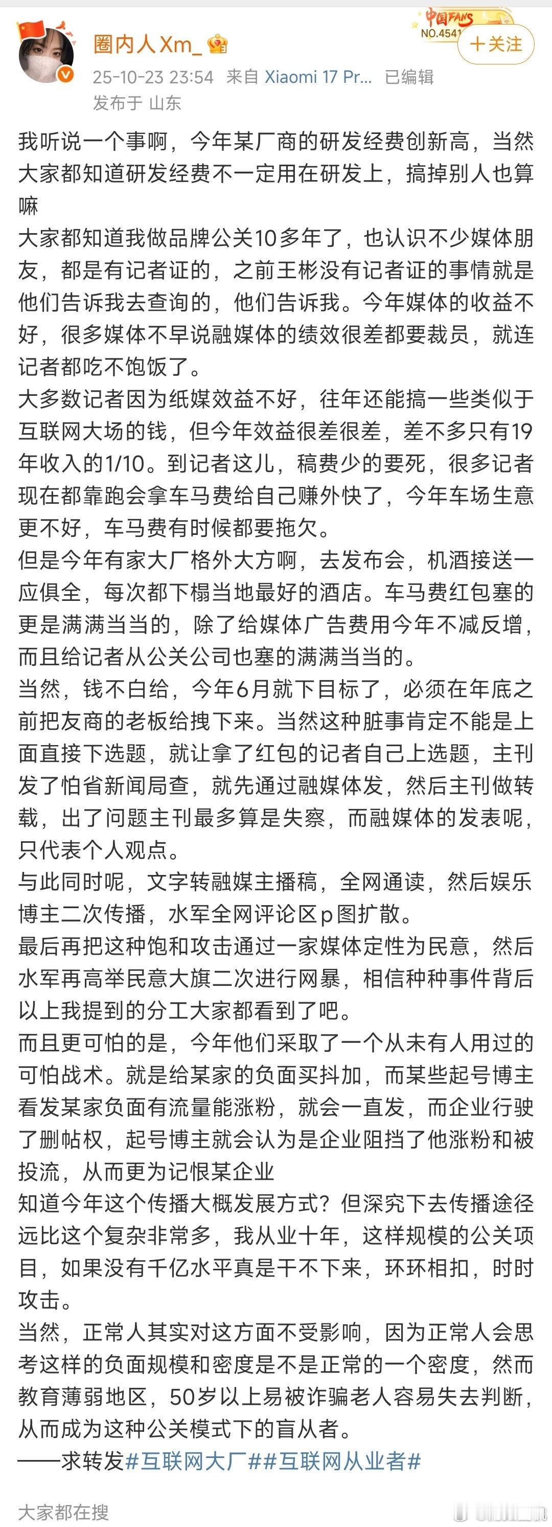 刚看到一位博主曝光了令人震惊的行业真相,难怪雷总的风评会突然一下变了,互联网到底是谁的天下?希望看到这些事情的后续真相。