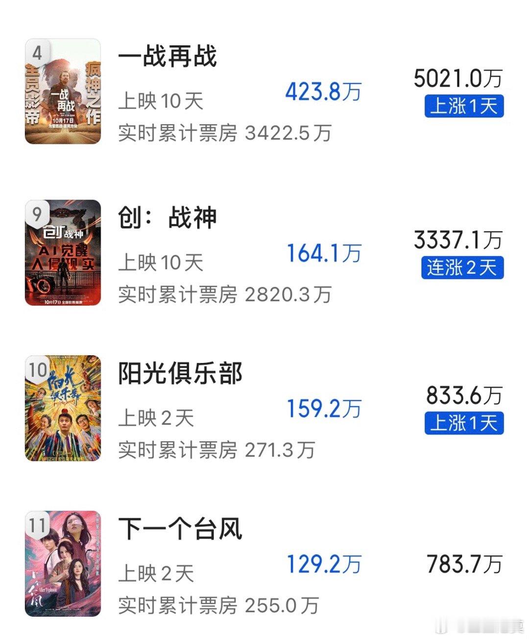 《下一个台风》首日票房210多万,《阳光俱乐部》首日票房190多万。上座率一个0.8%,一个1.6%。表现非常拉胯,可以说是扑大街了。两部影片预测票房均不足千万,看样子亏本已成事实。相比之下,《一战再战》就显得后劲十足。今天单日票房500万,预测票房也破了5000万。豆瓣8.2分的好口碑对影片票房的加持作用还是蛮大的。