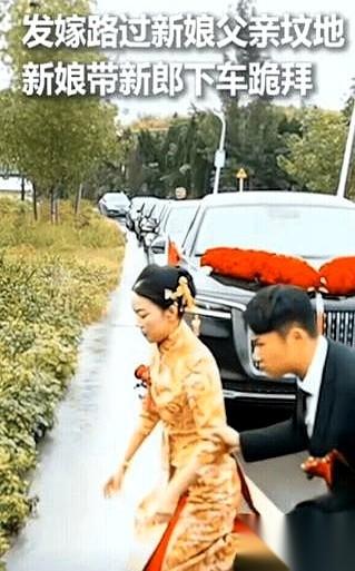 婚车开到一半,新娘突然喊停车。 然后穿着一身洁白的婚纱,提着裙子就下来了,直接跪在了刚下过雨的路边泥地里。 旁边,是她去世父亲的坟。 我当时看到这个,心里咯噔一下,眼泪差点就下来了。 更让我破防的,是那个新郎。他没有一丝犹豫,什么都没问,车门一开也跟着下来,整了整西装,陪着她一起,双腿就那么跪进了泥水里。 那一身笔挺的裤子啊,就这么废了。 可他好像根本不在乎。 新娘对着坟的方向哭着说:“爸爸,我走了……” 就这么简简单单几个字,是一个女儿在人生最重要的一天,心里最大的挂念。她不是在告别,她是在告诉爸爸:你看,这个男人,他会陪着我,你可以放心了。 真的,看一个男人值不值得嫁,别看他婚礼办多大,钻戒买多贵。 就看这种时候。 看他愿不愿意陪你,一起面对你心里最深的伤疤和遗憾。 很多人可能会说,大喜的日子,多不吉利。可一辈子的心结,和那点虚无缥缈的“吉利”比,哪个更重? 这个新郎用一个动作就给出了答案。他接过的,不只是一个新娘,而是她全部的过去,她心底里那个永远也长不大的小女孩。 他让她知道,你可以随时回头看,你的身后,有我。 这才是婚姻最该有的样子吧。 不是两个人搭伙过日子,而是我懂你所有的不容易。