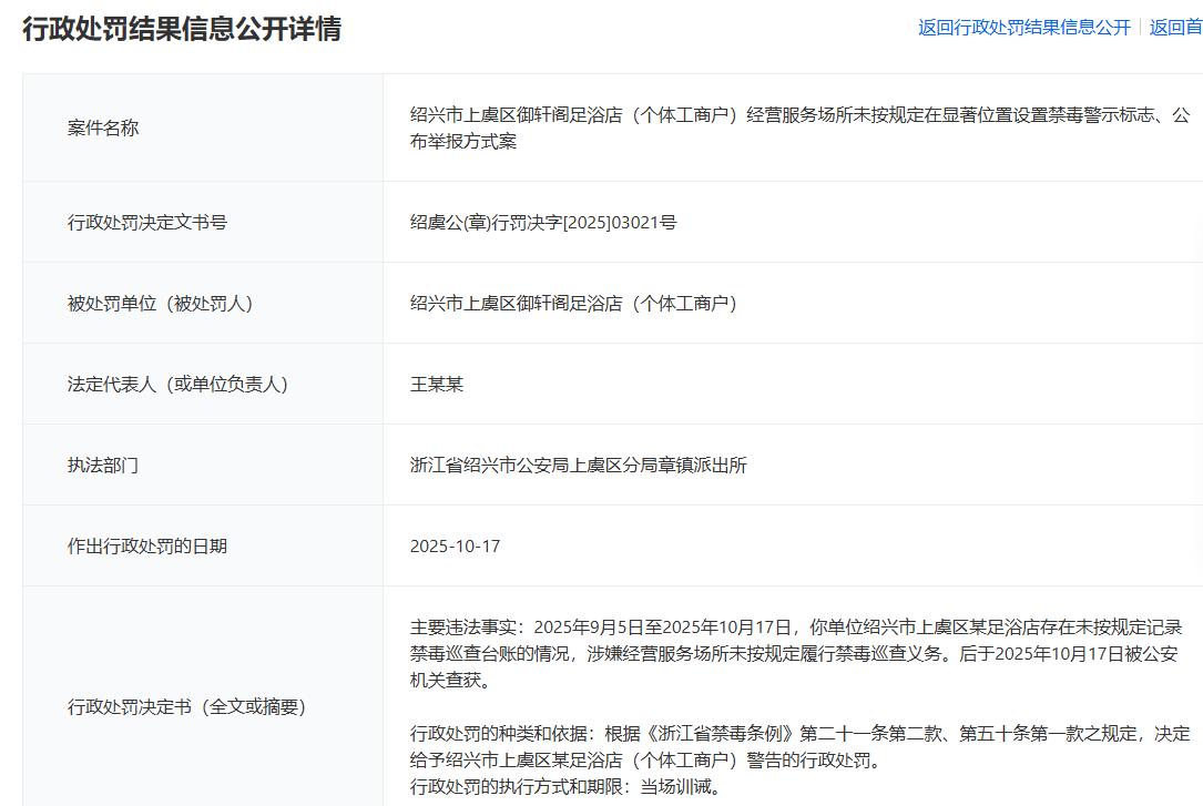 案件名称:绍兴市上虞区御轩阁足浴店(个体工商户)经营服务场所未按规定在显著位置设置禁毒警示标志、公布举报方式案