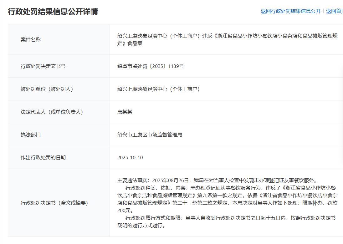 案件名称:绍兴上虞映象足浴中心(个体工商户)违反《浙江省食品小作坊小餐饮店小食杂店和食品摊贩管理规定》食品案