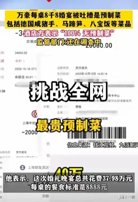 万豪疯了?还有诚信? 挑战全网,最贵预制菜~ 继西贝后,万豪是第一个顶风作案的。 勇气可嘉,死不承认。 8888元“天价”一桌的酒席就给上预制菜?为了赚钱脸不要了?赚了这次就不赚下一次了? 花38万办场婚礼,换来满桌带冰碴的预制菜? 明明提前确认过“100%无预制菜”,后厨却堆着德国咸猪手、八宝饭的预制包装,新鲜虾变成冷冻熟虾,白切鸡还带着血水。 这事不是个例。业内人早就透露,红烧肘子、狮子头这类婚宴硬菜,八成以上是预制的,2024年预制菜市场规模都冲到4850亿元了,婚宴就是主要“战场”。 问题是预制菜省事儿省成本。有利可图。就像网友说的:“888一桌用预制菜能理解,8888一桌还玩这套,就是把诚信按在地上摩擦”。 赚一次快钱,砸百年招牌?新人的婚礼就一次,被坑了只会逢人就骂;消费者的信任也只有一次,没了诚信,再豪华的装修也留不住客。