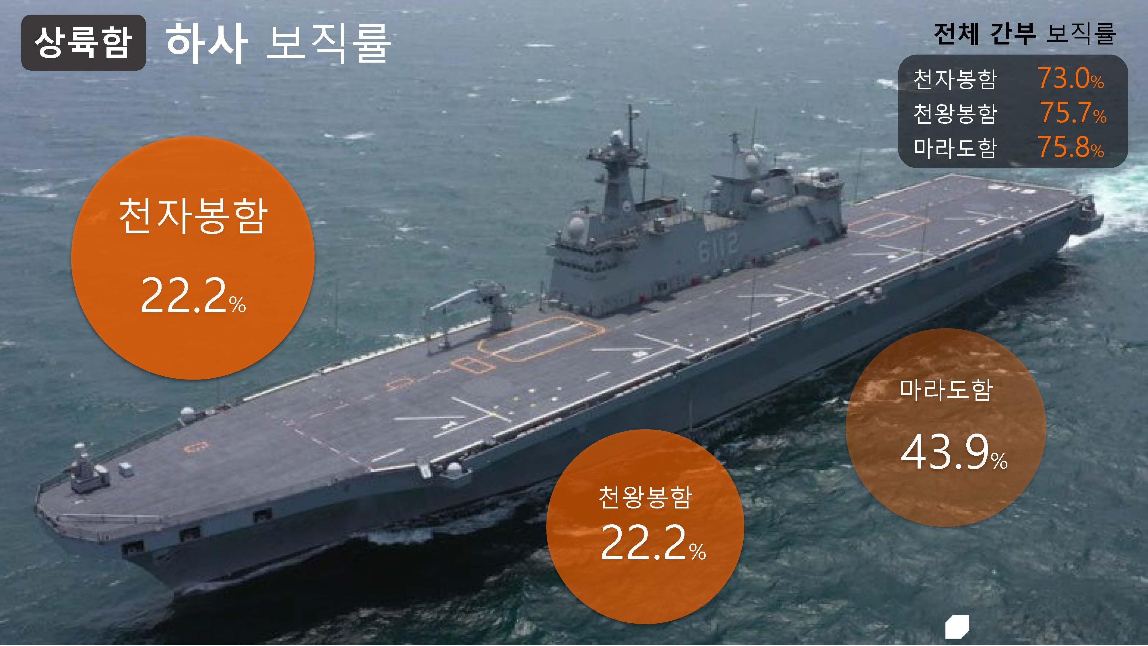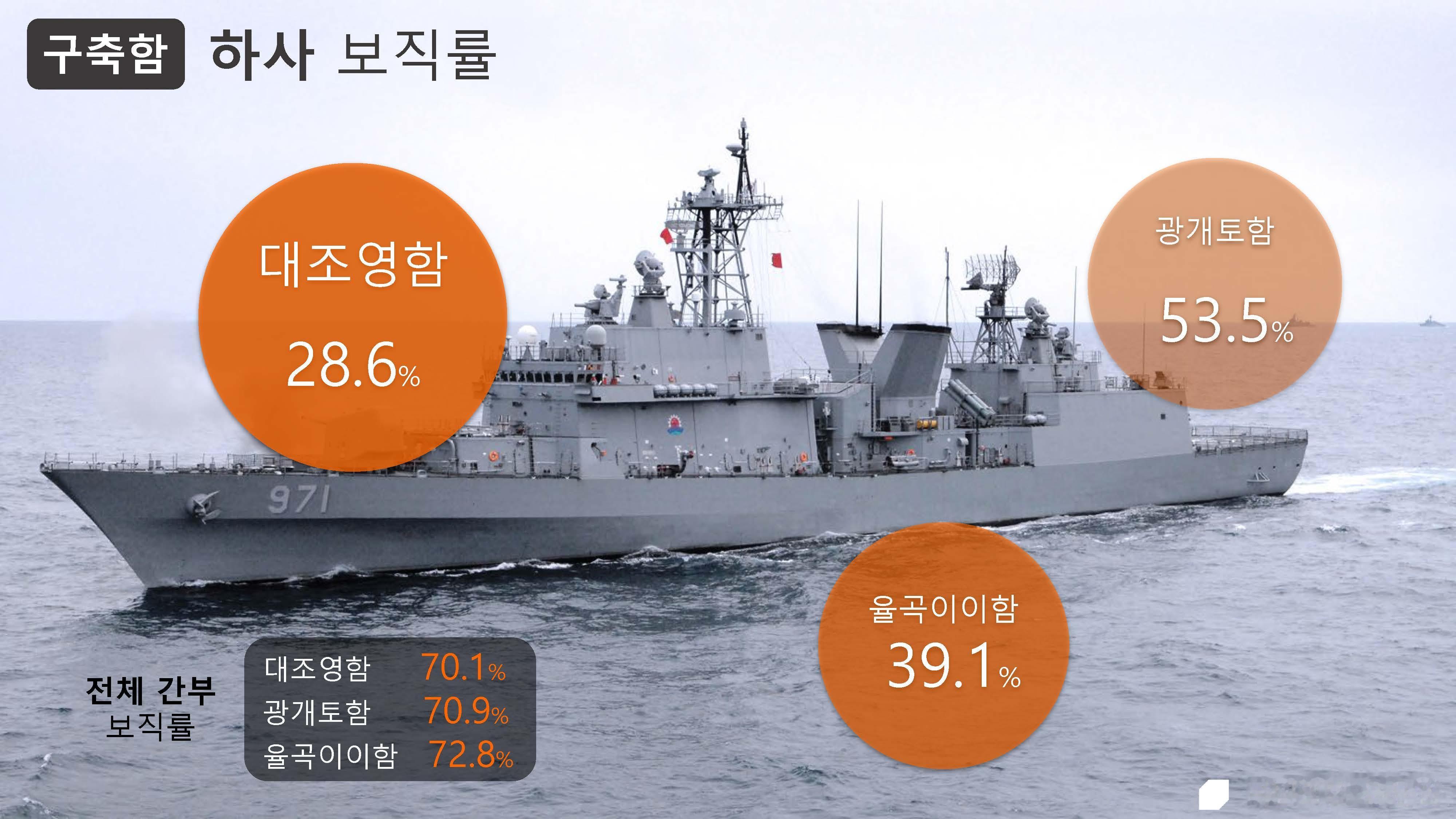用于反舰、反潜、舰队防空等多种任务的“驱逐舰”也显现出下士职位分配率较低的情况。海军的主力战舰之一“大祚荣号”的下士职位分配率为28.6%,而“栗谷李一号”为39.1%, “广开土大王号”为53.5%,显示出这些舰艇也存在严重的人员缺口。