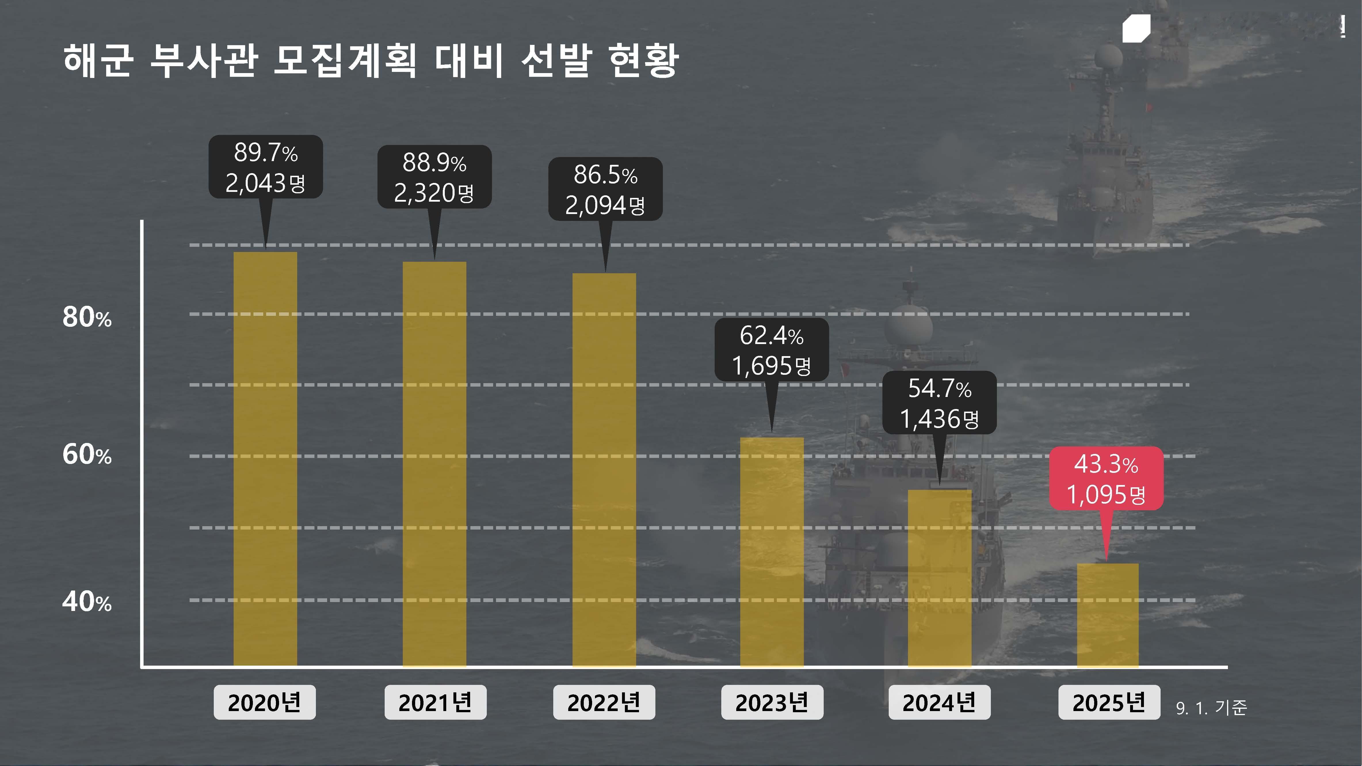 面对韩国海军主要舰艇下士职位分配率低的问题,海军在新任下士招募方面也遇到了巨大困难。过去五年新任下士的选拔率分别为:2020年89.7%、2021年88.9%、2022年86.5%、2023年62.4%、2024年54.7%,呈现出逐年下降的趋势。特别是截至今年9月,选拔率仅为43.3%,创下历史新低,预计将成为历年来最低的选拔率。